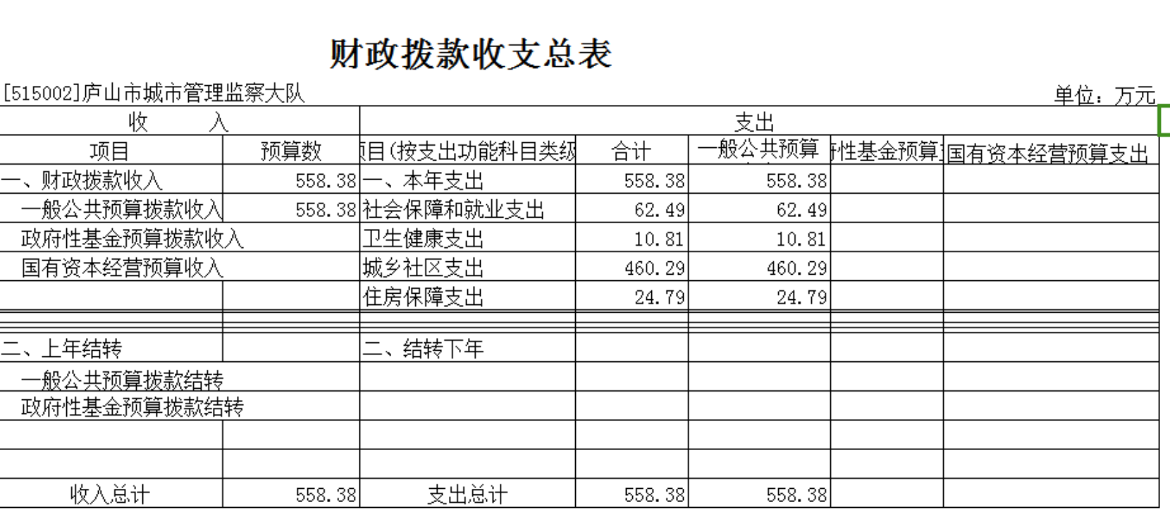 按支出功能科目划分:一般公共服务支出558.38万元。 社会保障和就业支出62.49万元,较上年预算安排增加31.37万元;卫生健康支出10.81万元,较上年预算安排减少0.14万元;城乡社区支出460.29万元,较上年预算安排增加32.04万元;住房保障支出24.79万元,较上年预算安排增加1.16万元。