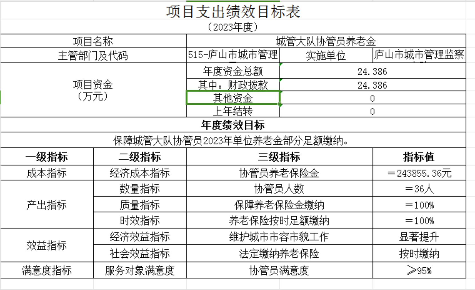 4)实施方案:关于2023年庐山市城管大队协管员养老保险金单位缴纳部分由财政负担,全年养老保险金24.386万元(3528元*16%*36人*12月)用于城管大队协管员养老保险金支出。