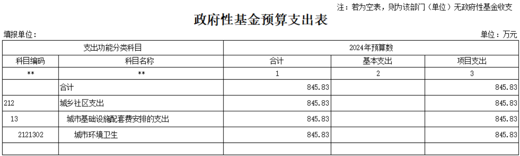2024年市政公用设施管护中心政府性基金支出预算为845.83万元,按支出项目类别划分:项目支出845.83万元,其中:商品和服务支出845.83万元。