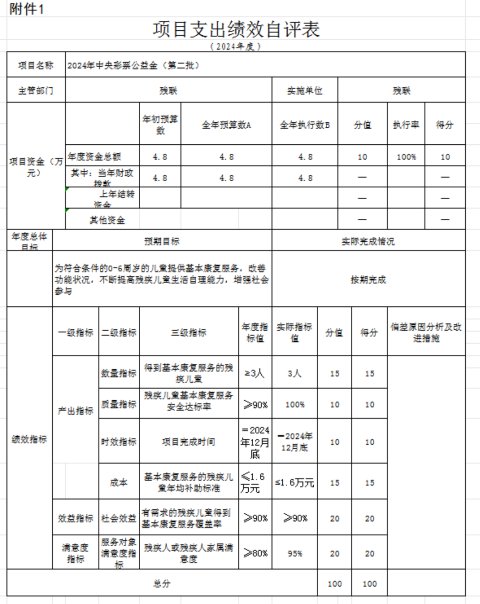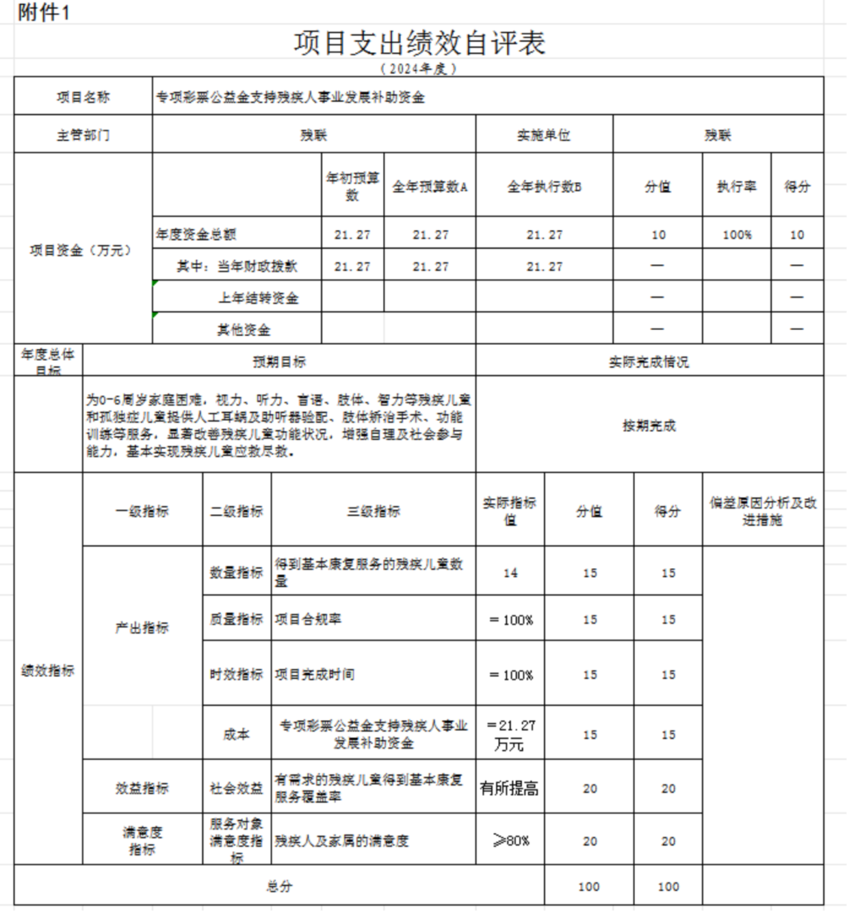 庐山市残疾人联合会(本级)“中央一般公共预算残疾人事业发展补助资金”、“省级一般公共预算残疾人事业发展补助资金”、“专项彩票公益金支持残疾人事业发展补助资金”、“福利彩票公益金支持残疾人事业发展补助资金”、“2024年中央彩票公益金(第二批)”、“2024年中央专项彩票公益金支持残疾人事业发展”项目绩效自评表等项目支出绩效自评结果如下