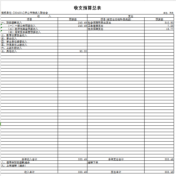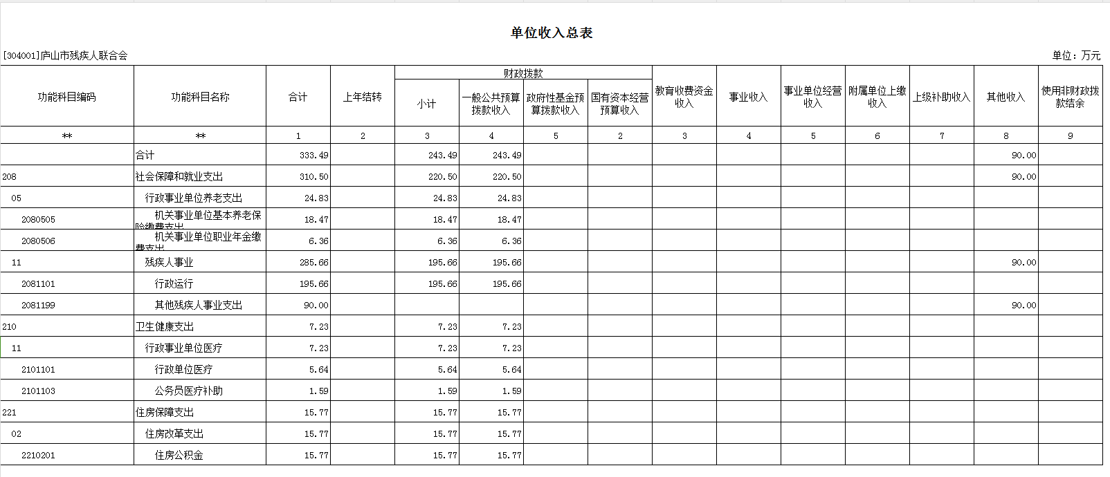 2023年庐山市残疾人联合会收入预算总额333.49为万元,较上年预算安排增加0.97万元。;财政拨款收入243.49万元,较上年预算安排减少89.03万元。(变动原因:2021年结余资金到2022年,2022年无资金结转到2023年,2023年单位自有资金纳入预算)。