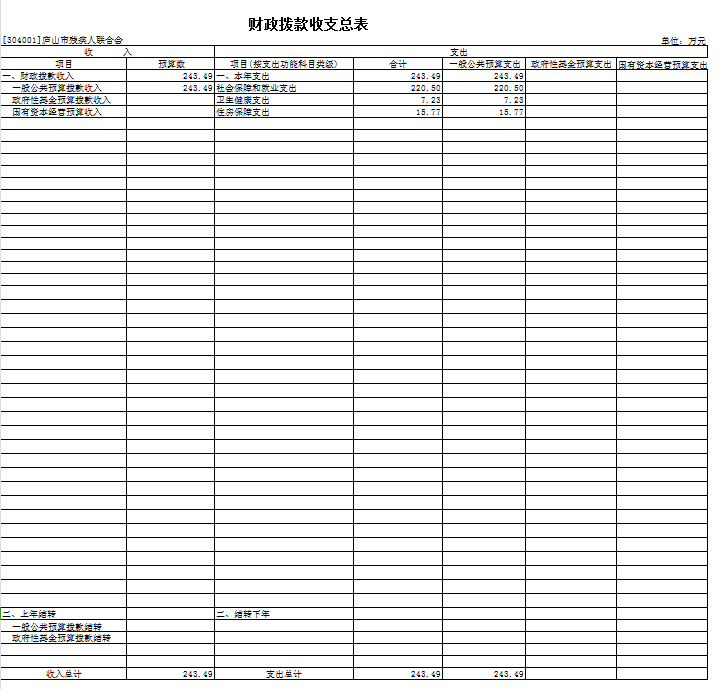2023年庐山市残疾人联合会财政拨款支出预算总额243.49万元,较上年预算安排减少89.03万元;(变动原因:2021年结余资金到2022年,2022年无资金结转到2023年。)