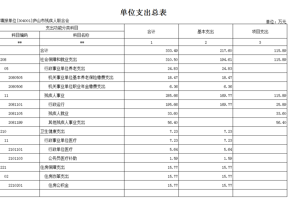 2023年庐山市残疾人联合会支出预算总额333.49万元,较上年预算安排增加0.97万元;(变动原因:变动原因:2021年结余资金到2022年,2022年无资金结转到2023年,2023年单位自有资金纳入预算。)