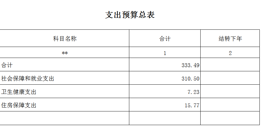 按支出功能科目划分: 一般公共服务支出310.49万元,较上年预算安排增加53.3万元;卫生健康支出7.23万元,较上年预算安排增加1.87万元;住房保障支出15.77万元,较上年预算安排增加4.19万元。其他支出0万元,较上年减少58.39万元。