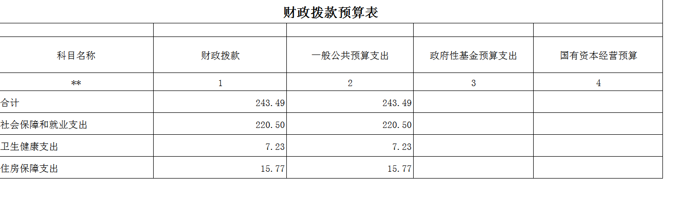 按支出功能科目划分:社会保障和就业支出220.49万元,较上年预算安排减少36.71万元;卫生健康支出7.23万元,较上年预算安排增加1.88万元;住房保障支出15.77万元,较上年预算安排增加4.19万元;其他支出0万元,较上年减少58.39万元。
