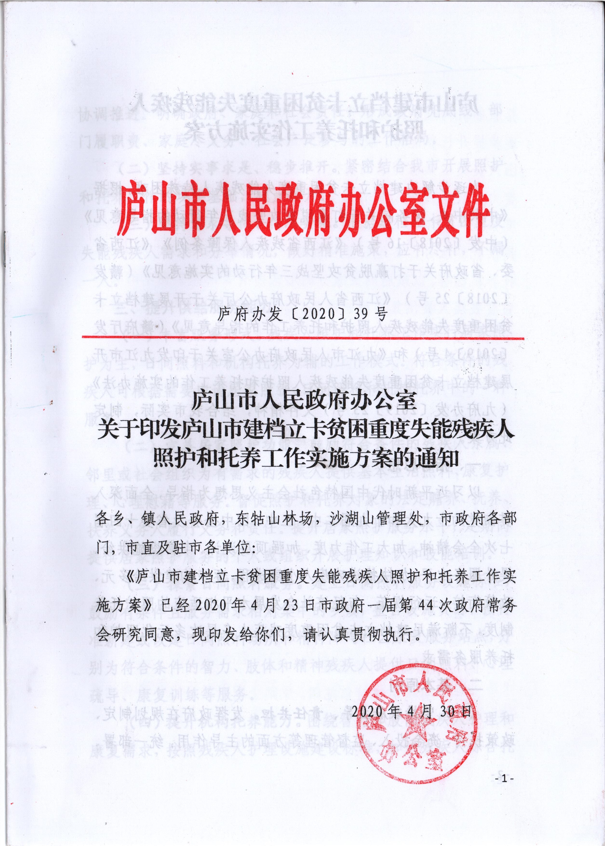 庐山市建档立卡贫困重度失能残疾人照护和托养工作实施方案的通知
