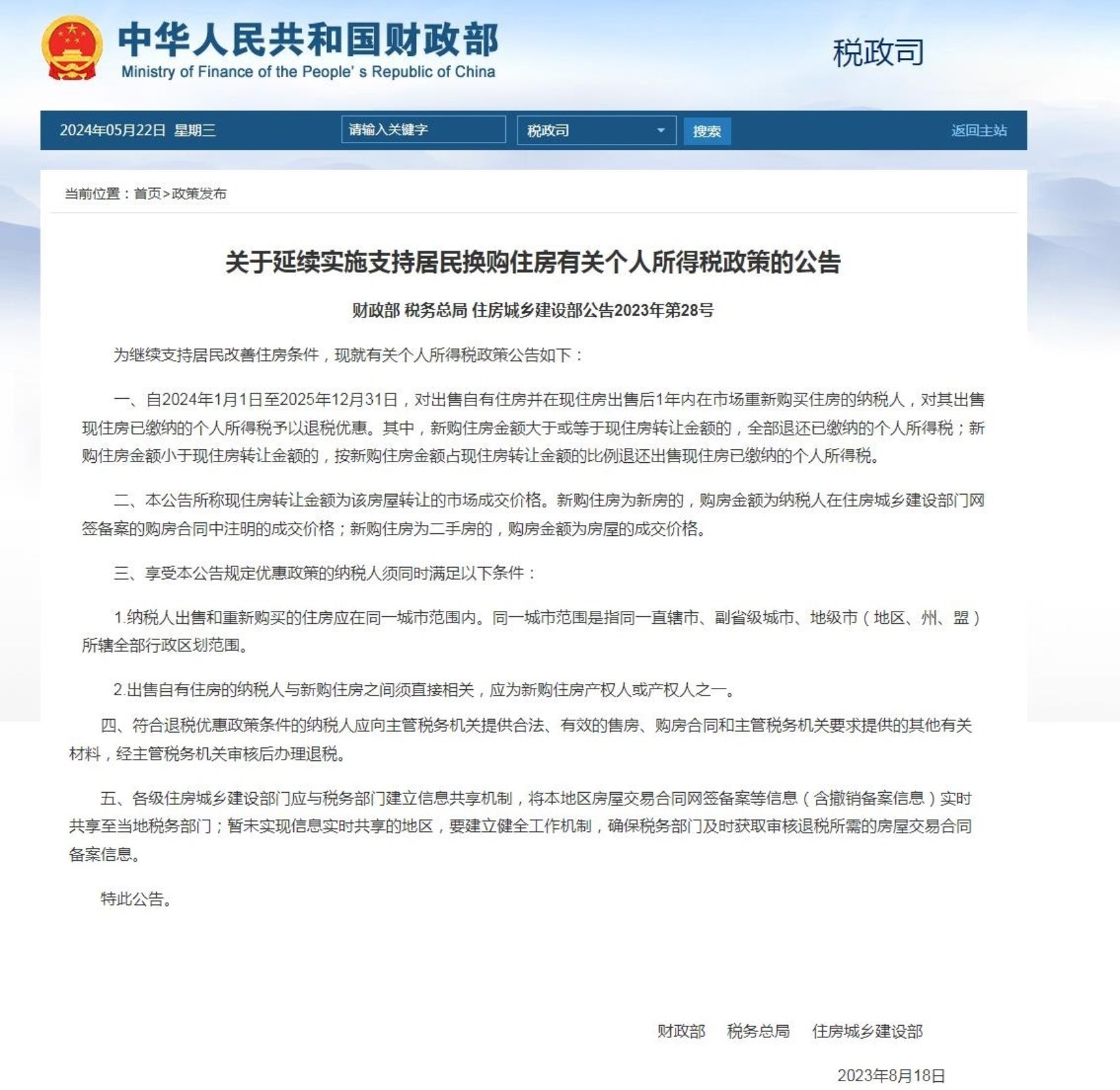 一、自2024年1月1日至2025年12月31日,对出售自有住房并在现住房出售后1年内在市场重新购买住房的纳税人,对其出售现住房已缴纳的个人所得税予以退税优惠。其中,新购住房金额大于或等于现住房转让金额的,全部退还已缴纳的个人所得税;新购住房金额小于现住房转让金额的,按新购住房金额占现住房转让金额的比例退还出售现住房已缴纳的个人所得税。