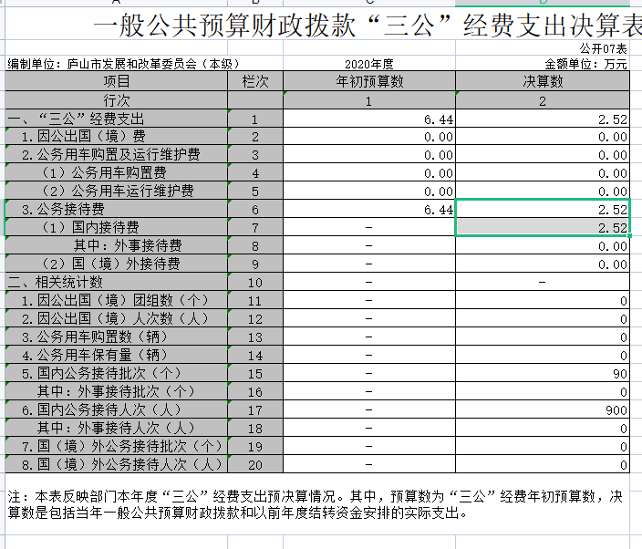 (二)公务接待费支出年初预算数为6.4414万元,决算数为2.5157万元,完成预算的39%,决算数较2019年减少0.21 万元,下降0.8 %,主要原因是:严格遵守公务接待开支范围和开支标准,严格控制陪餐人数。决算数较年初预算数减少的主要原因是:严格遵守公务接待开支范围和开支标准,严格控制陪餐人数……。全年国内公务接待90批,累计接待900人次。