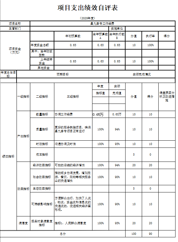 项目绩效自评总体综述:根据年初设定的绩效目标,昌九客专项目绩效自评得分为90分。项目全年预算数为0.65万元,执行数为0.65万元,完成预算的100%。项目绩效目标完成情况:一是质量指标;二是时效指标;三是经济效益标;社会效益指标;