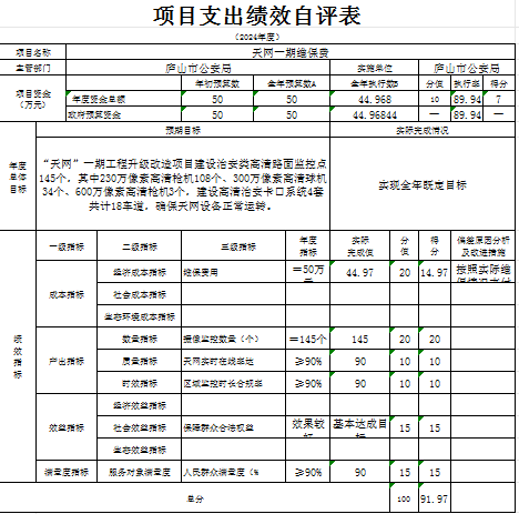 本单位“天网一期维保费”项目支出绩效自评结果如下:
