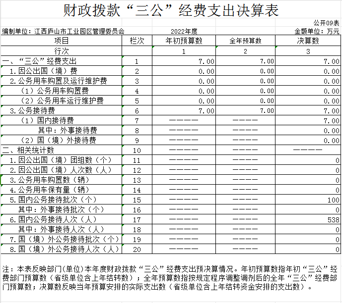 本部门2022年度财政拨款“三公”经费支出全年预算数为 7万元,决算数为7万元,完成全年预算的100%,决算数较2021年减少2.38万元,下降25.37%,其中: