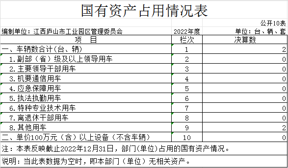 截止2022年12月31日,本部门国有资产占用情况见公开10表《国有资产占用情况表》。其中车辆中的其他用车两辆,主要是用于工业园区日常巡逻检查。