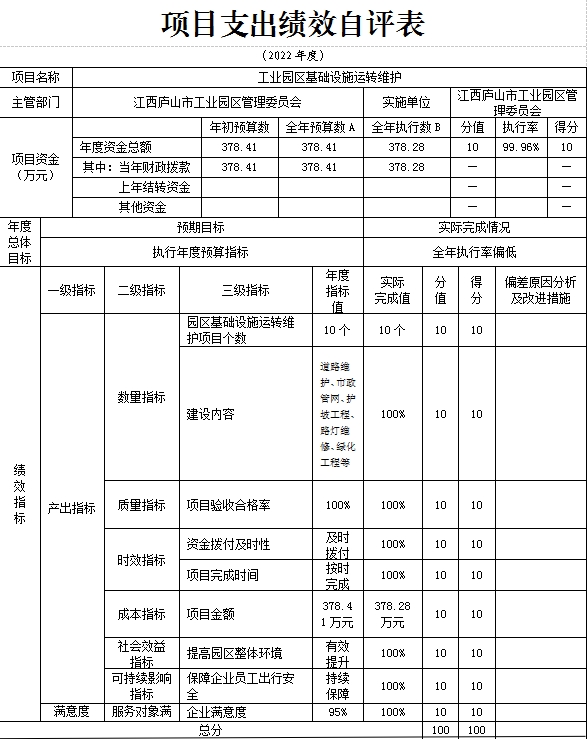 组织对“2022年“两新”组织专职党建工作指导员经费”、“2022年招商工作经费”、“扶持企业发展资金(庐山市污水处理厂)”、“工业园2022年调整工作经费”、“工业园第三方购买服务”、“工业园第三方购买服务”、“工业园环境整治”、“工业园区基础设施运转维护”等8个项目开展了部门评价,涉及一般公共预算支出4440.36万元,政府性基金预算支出0万元,国有资本预算支出0万元。从评价情况来看,以上8个项目绩效自评平均得分为98分,其中6个项目绩效自评得分为满分。项目全年预算数为7547.70万元,执行数为4440.36万元,完成预算的58.83%。