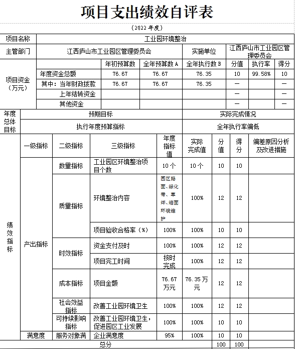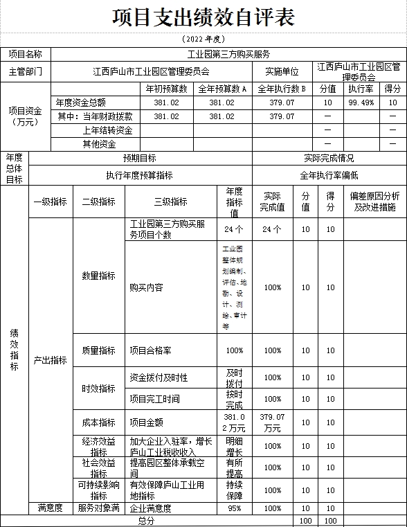 (二)总体绩效目标完成情况分析。提高园区整体承载空间、有效保障庐山工业用地指标、企业满意度达95%以上。