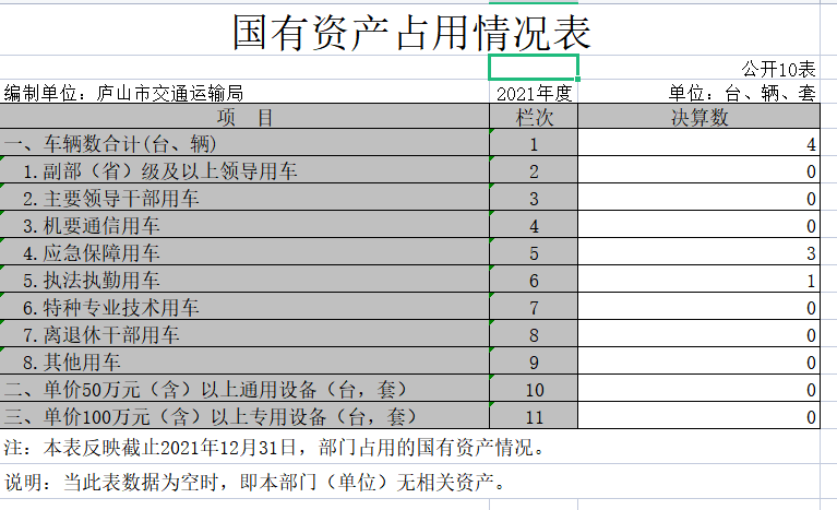截止2021年12月31日,本部门(单位)国有资产占用情况见公开10表《国有资产占用情况表》共有车辆 4辆,其中,副部(省)级及以上领导用车0 辆、主要领导干部用车 0辆、机要通信用车 0 辆、应急保障用车 0 辆、执法执勤用车1辆、特种专业技术用车0 辆、其他用车 3 辆,其他用车主要是公路养护等用途。单位价值50万元以上通用设备 0台(套);单位价值100万元以上专用设备 0台(套)。