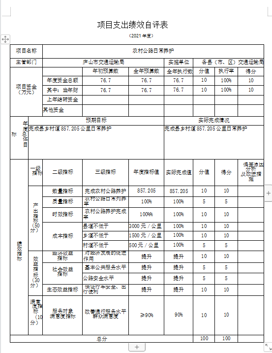 组织对“农村公路日常养护—农村公路日常养护”、“G532国道(横塘段)工程”、“庐山市路域环境改造提升项目”“庐山市四好农村公路改造提升项目”等 4个项目开展了部门评价,涉及一般公共预算支出99.28万元,政府性基金预算支出 9930万元。从评价情况来看,基本完成各项指标。