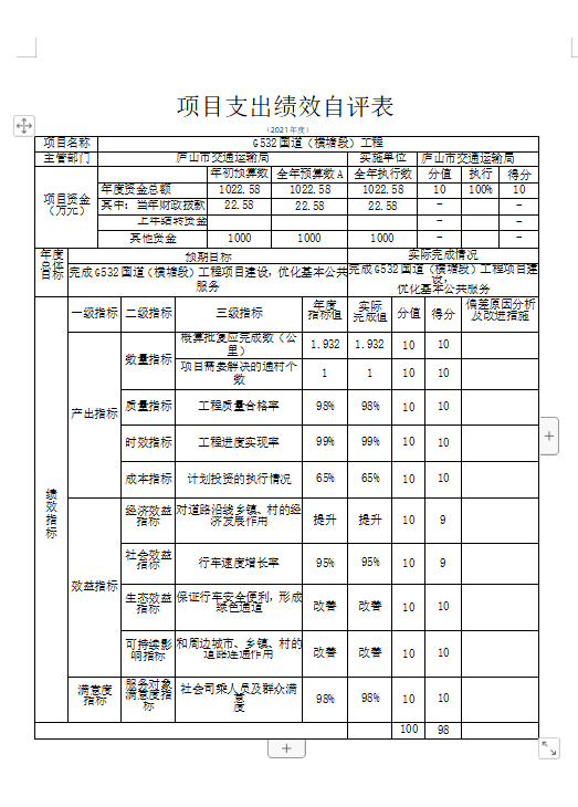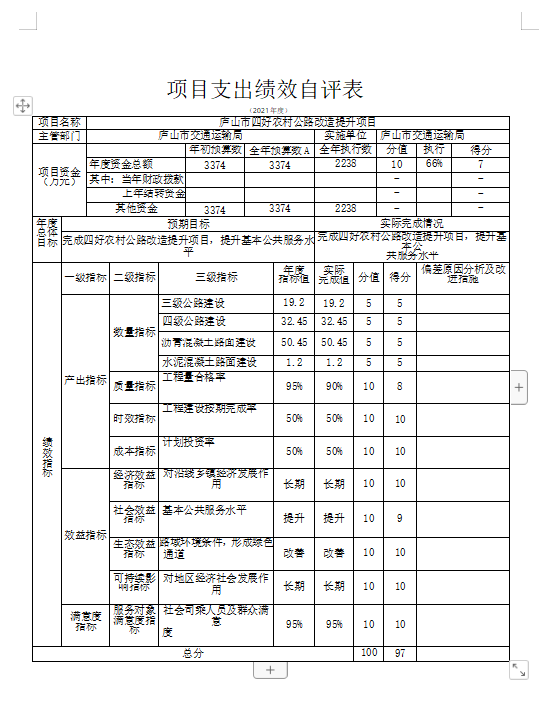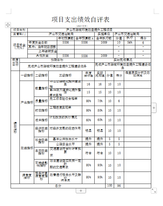 项目绩效自评总体综述,根据预算绩效管理要求,根据年初设定的绩效目标,公路建设项目绩效自评得分为 98分。项目全年预算数为10029.28万元,执行数为 6346.28万元,完成预算的63.27%。项目绩效目标完成情况:一是时效指标及时拨付;二是生态环境改善明显,三是司乘人员及群众满意度提高。发现的问题及原因:一是工作有待细化;二是绩效专业性不够。下一步改进措施:一是加强学习,健全体系;二是科学考核,三是注重实效。