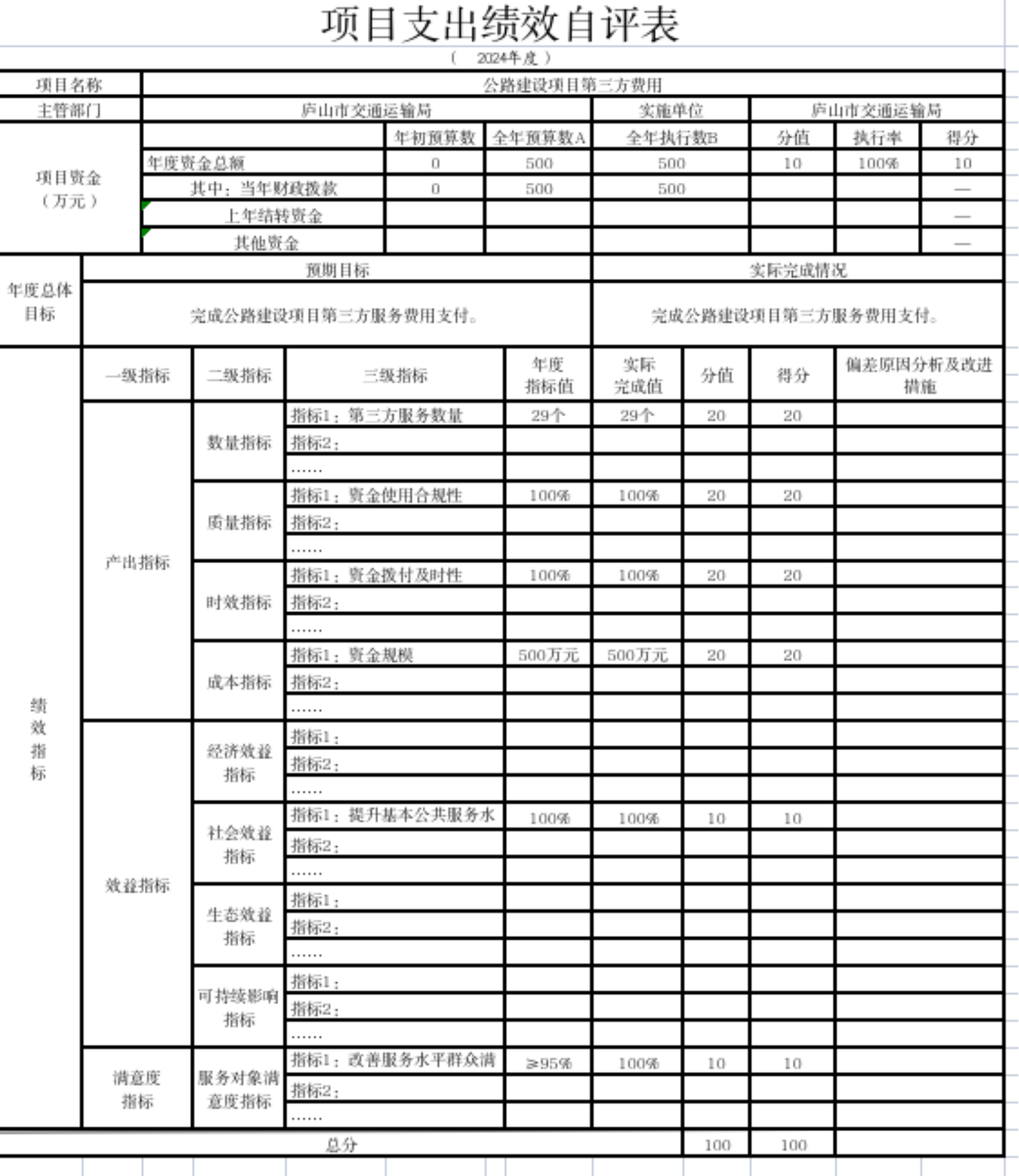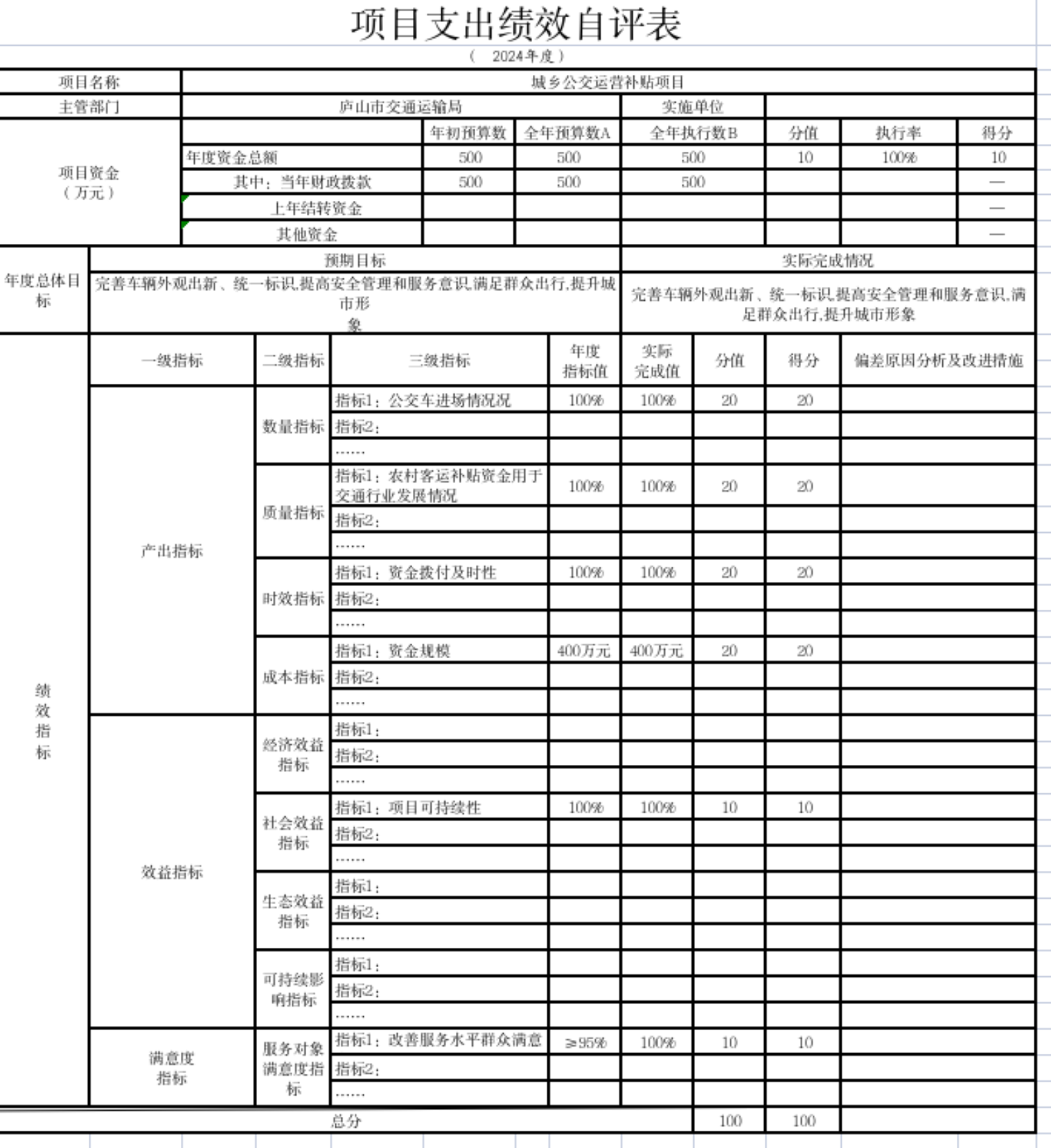 产出指标下设置了“质量指标”“数量指标”“时效指标”三个二级指标,下属分别设置了“农村客运补贴资金用于交通行业发展情况”(指标值为100%)“公交车进场情况”指标值为100%)“资金拨付及时率(指标值为100%)”,完成率为100%,达到了预期的绩效目标,实现了预期的指标值。