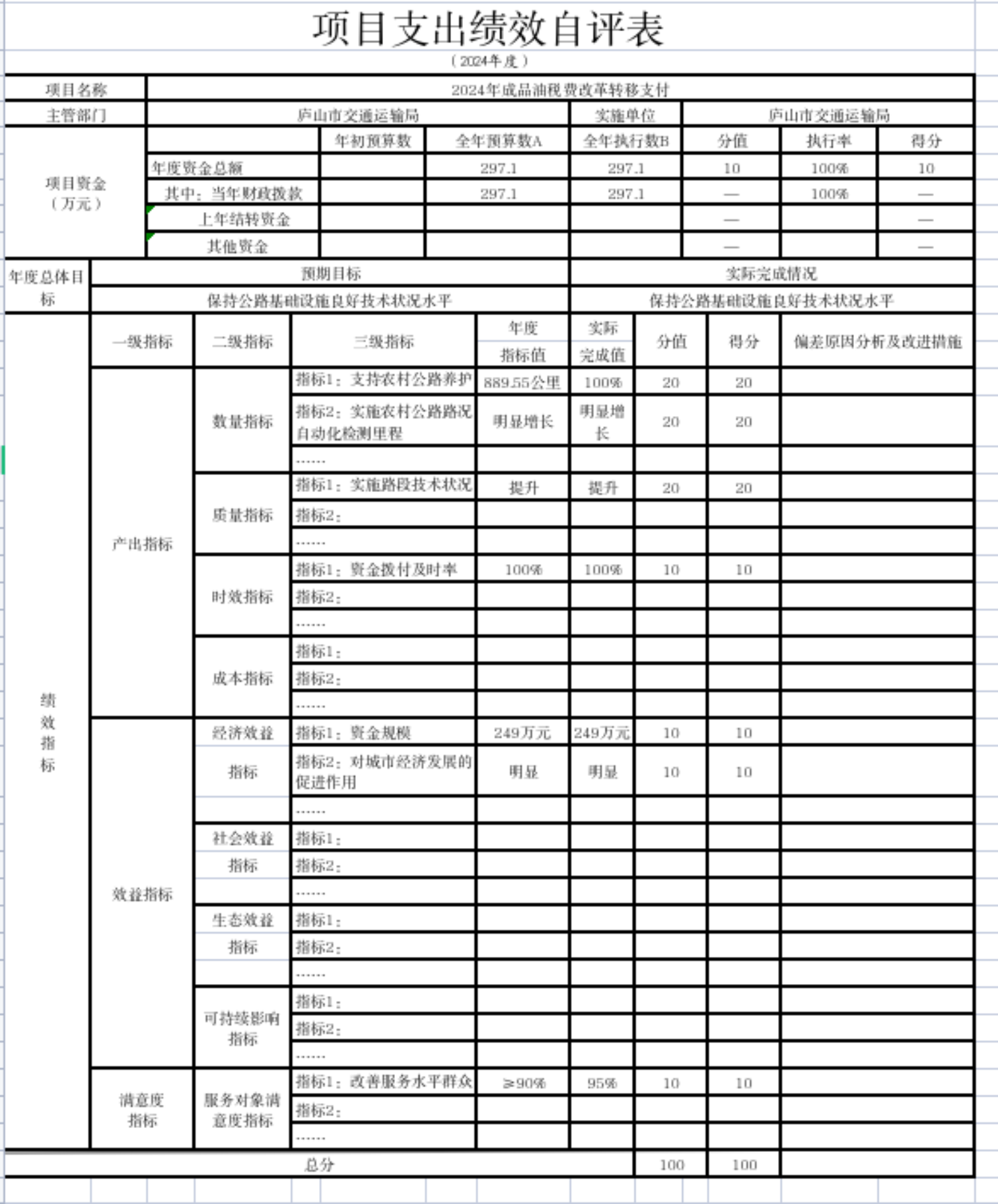 为完成“十四五”现代综合交通运输体系发展规划范围内的综合交通、公路、水运等年度建设任务中支持农村公路日常养护任务。加强我市农村公路、桥梁日常养护管理工作,及时改善农村公路通行条件,保障农村公路、桥梁通行安全。2024年中央财政成品油税费改革转移支付297.1万元,用于实施庐山市886.055公里农村公路的养护,截至目前该资金已支付完。项目的完成达到了建设目的,很好的完成了绩效目标。