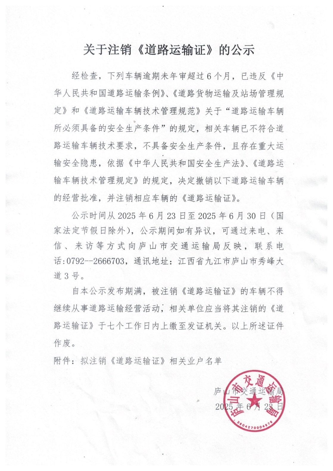 关于注销《道路运输证》的公示