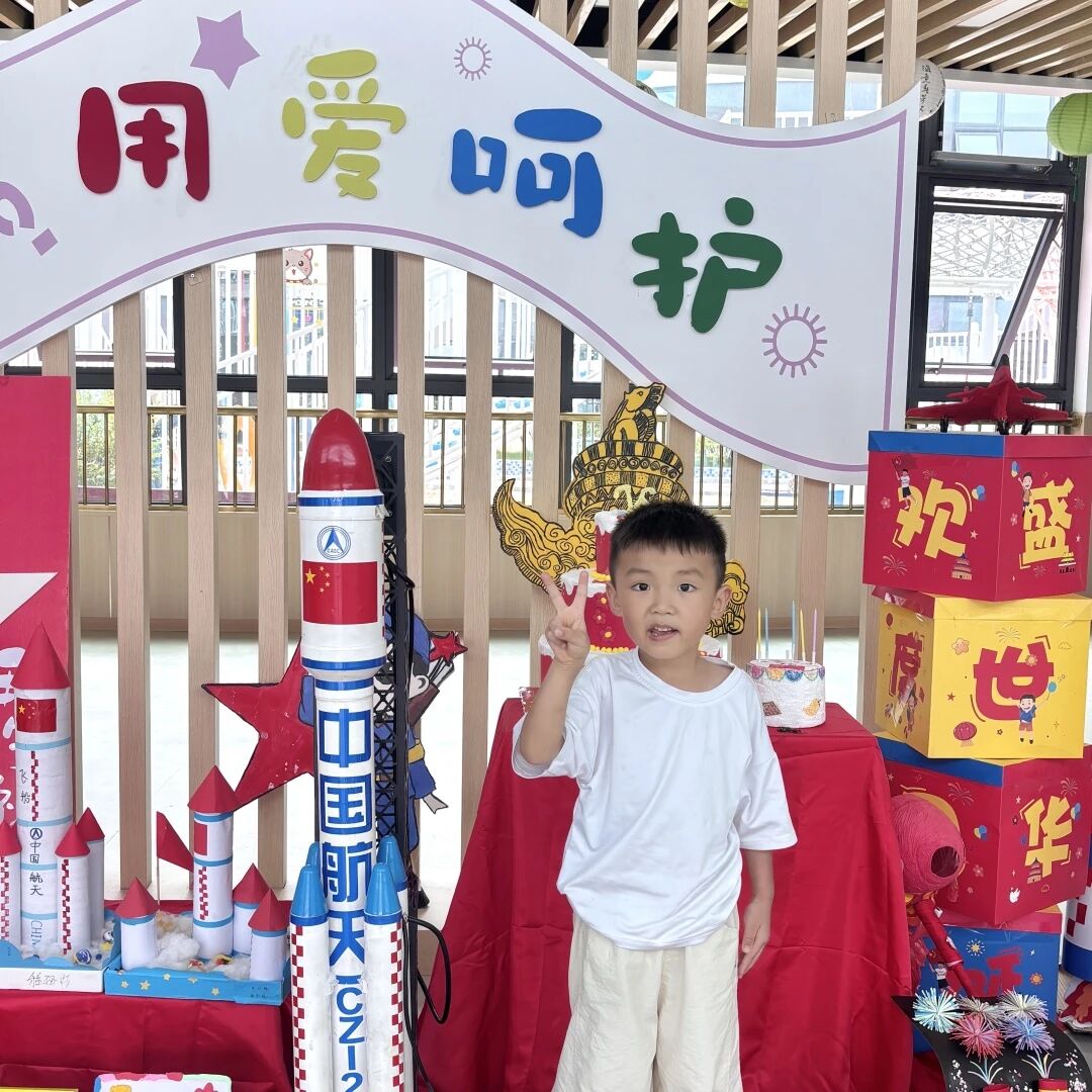 走进幼儿园的展览区,仿佛踏入了一个充满童趣与热爱的 “爱国小天地”。废旧纸盒拼成的 “天安门” 前,飘扬着孩子们亲手绘制的五星红旗,象征着我们祖国的欣欣向荣。从收集废旧材料,到一笔一画描摹“中国航天”字样,再到用棉花营造“升空云雾”的氛围,每一步都有亲子互动欢乐的影子。