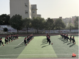 阳光洒满操场,校园里活力四射。篮球场上,孩子们弓步屈膝,专注地练习运球;足球训练中,他们脚踩足球,认真进行传球练习,长长的影子里满是投入。