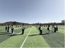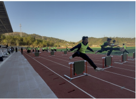 绿茵场上,身着荧光绿背心的学生在足球课上展现出良好的纪律性。篮球与足球教学注重基本功,学生们在分组练习中规范抛球技巧、夯实控球基础。跑道上,跨栏教学同步进行,学生在指导下练习起跑与跨栏动作,姿态协调,充分体现了体育教学对技能规范化的重视。