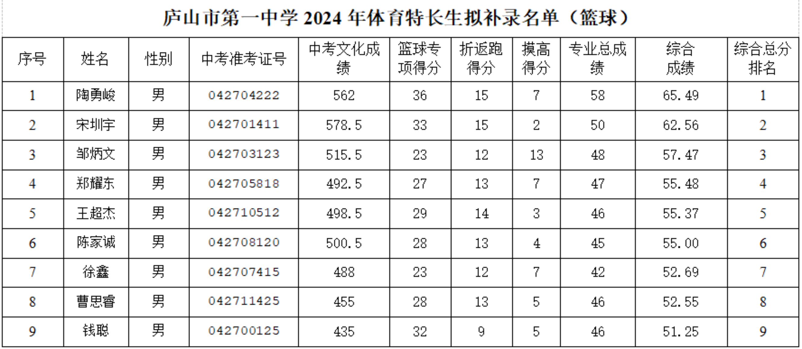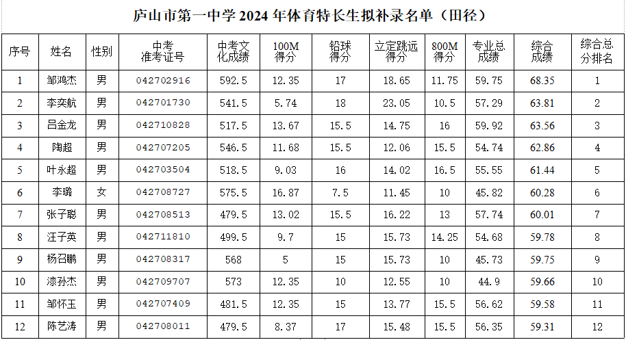 根据《庐山市一中2024级高中体育特长班招生工作方案》及2024年7月14日体育专业测试结果,第一批体育特长生共录取19人(其中田径16人,篮球3人),未满40人。因《庐山市一中2024级高中体育特长班招生工作方案》计划录取40人,其中田径28人,篮球12人,尚缺21人。经学校研究,并报请上级部门同意,拟对体育特长班不足名额进行补录,补满为止。现将补录名单、成绩及补录原则公告如下: