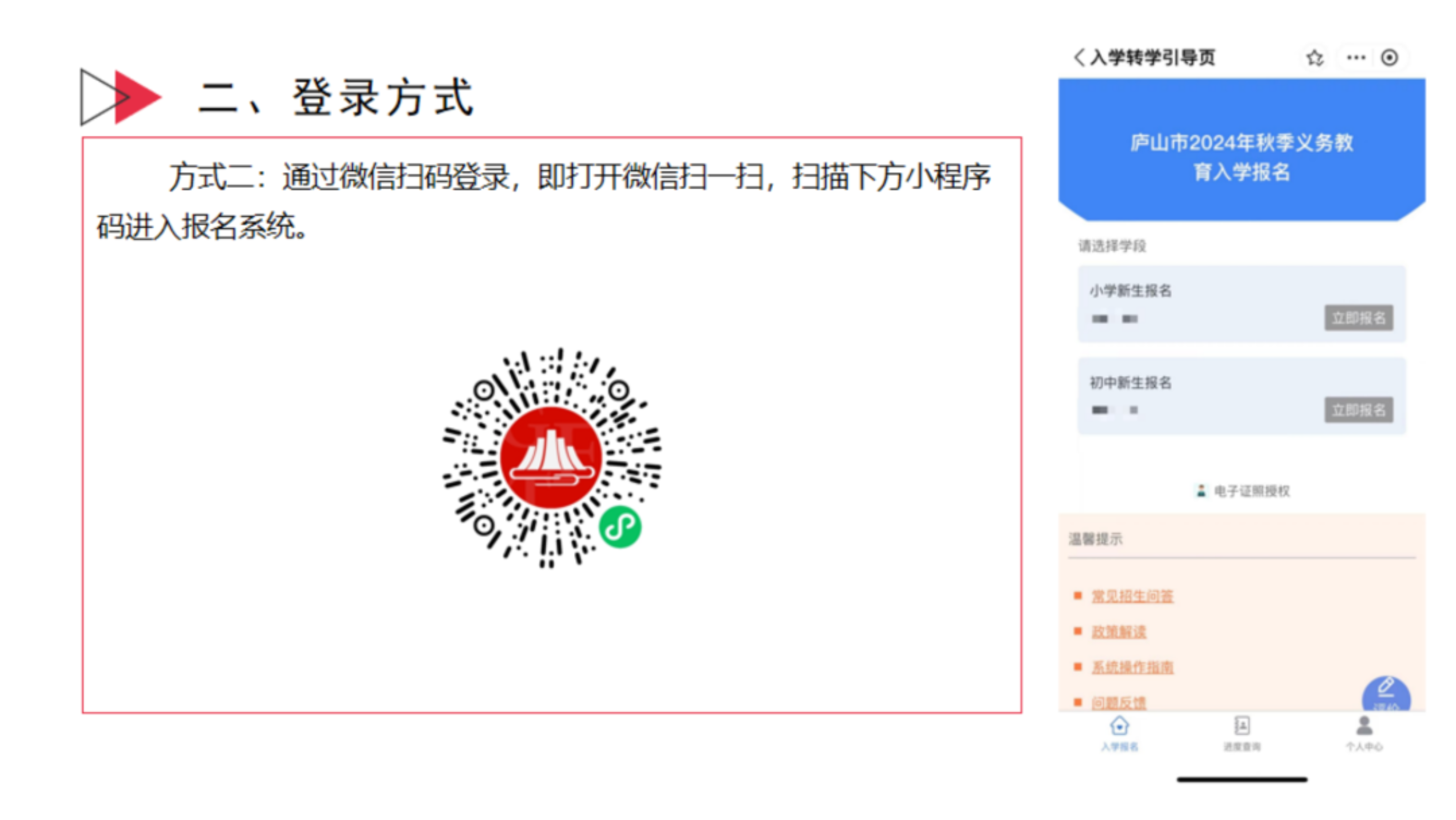 1.家长通过支付宝或微信APP扫码进入“庐山市2024义务教育入学报名系统”,共享公安户籍、不动产、住建等大数据信息,信息核查将以报名系统自动校验为准。