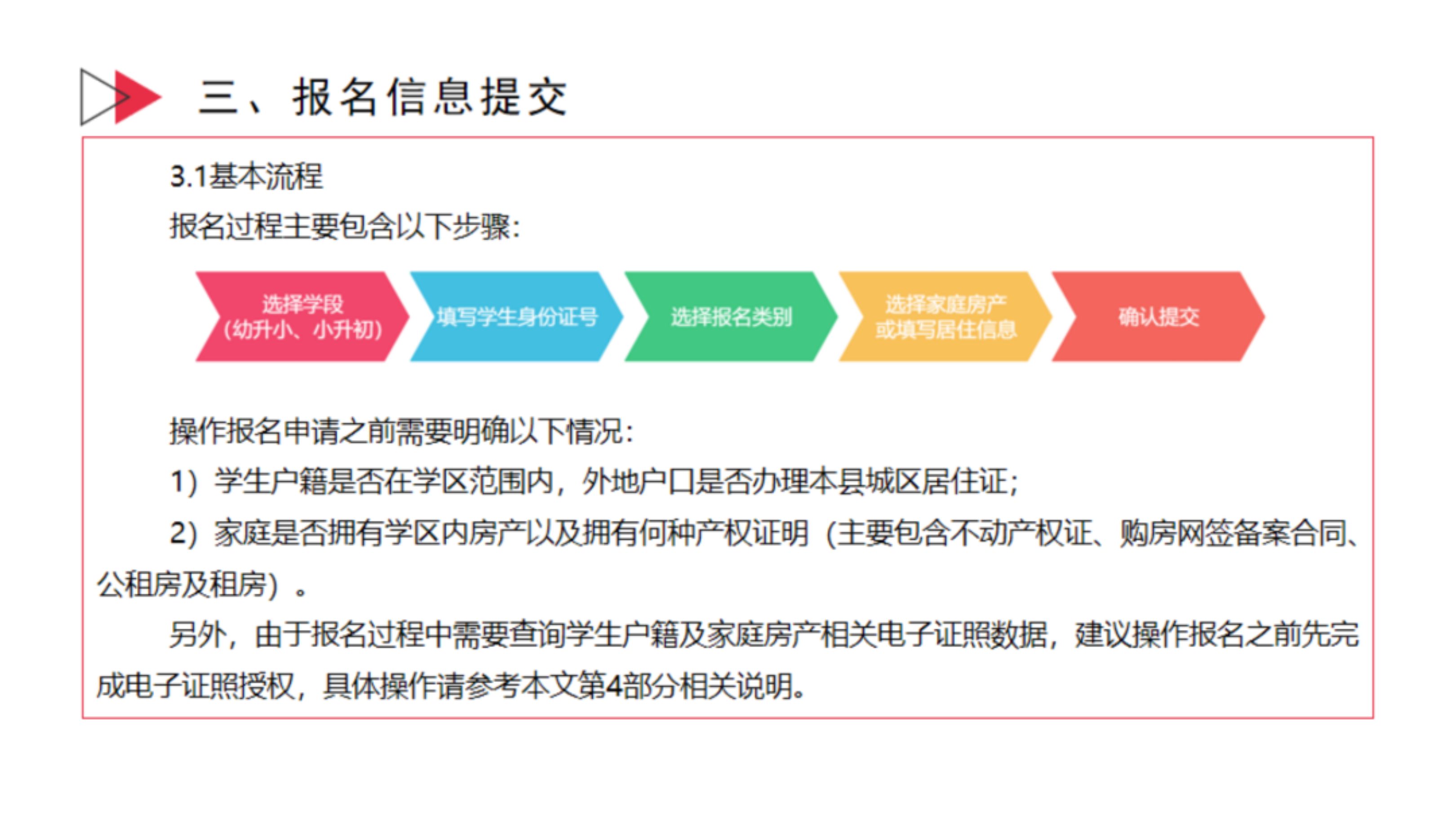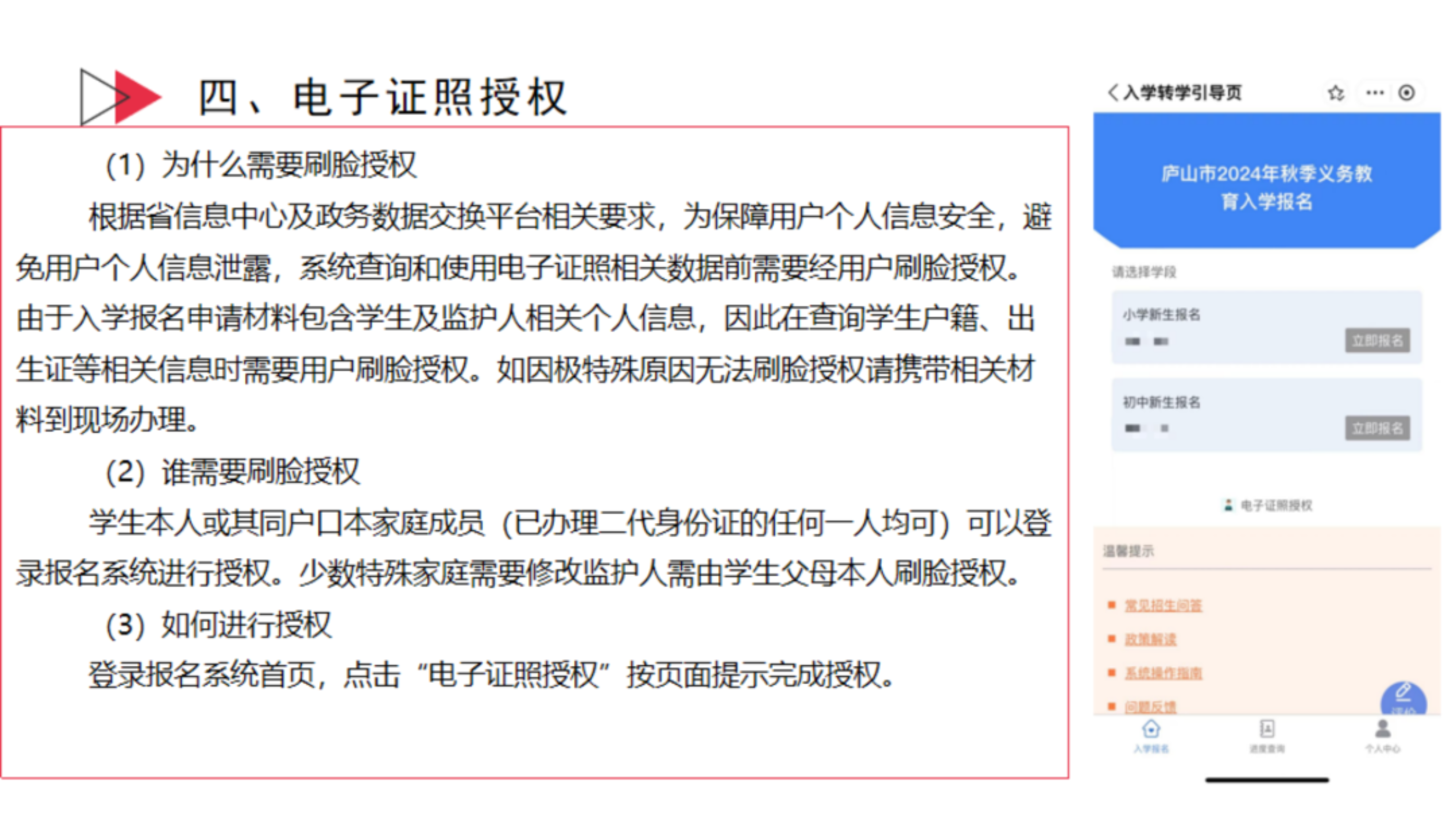 答:根据省信息中心及政务数据交换平台相关要求,为保障用户个人信息安全,避免用户个人信息泄露,系统查询和使用电子证照相关数据前需要经用户刷脸授权。由于入学报名申请材料包含学生及监护人相关个人信息。因此,在查询学生户籍、出生证等相关信息时需要用户刷脸授权。如因极特殊原因无法刷脸授权请携带相关材料到现场办理。