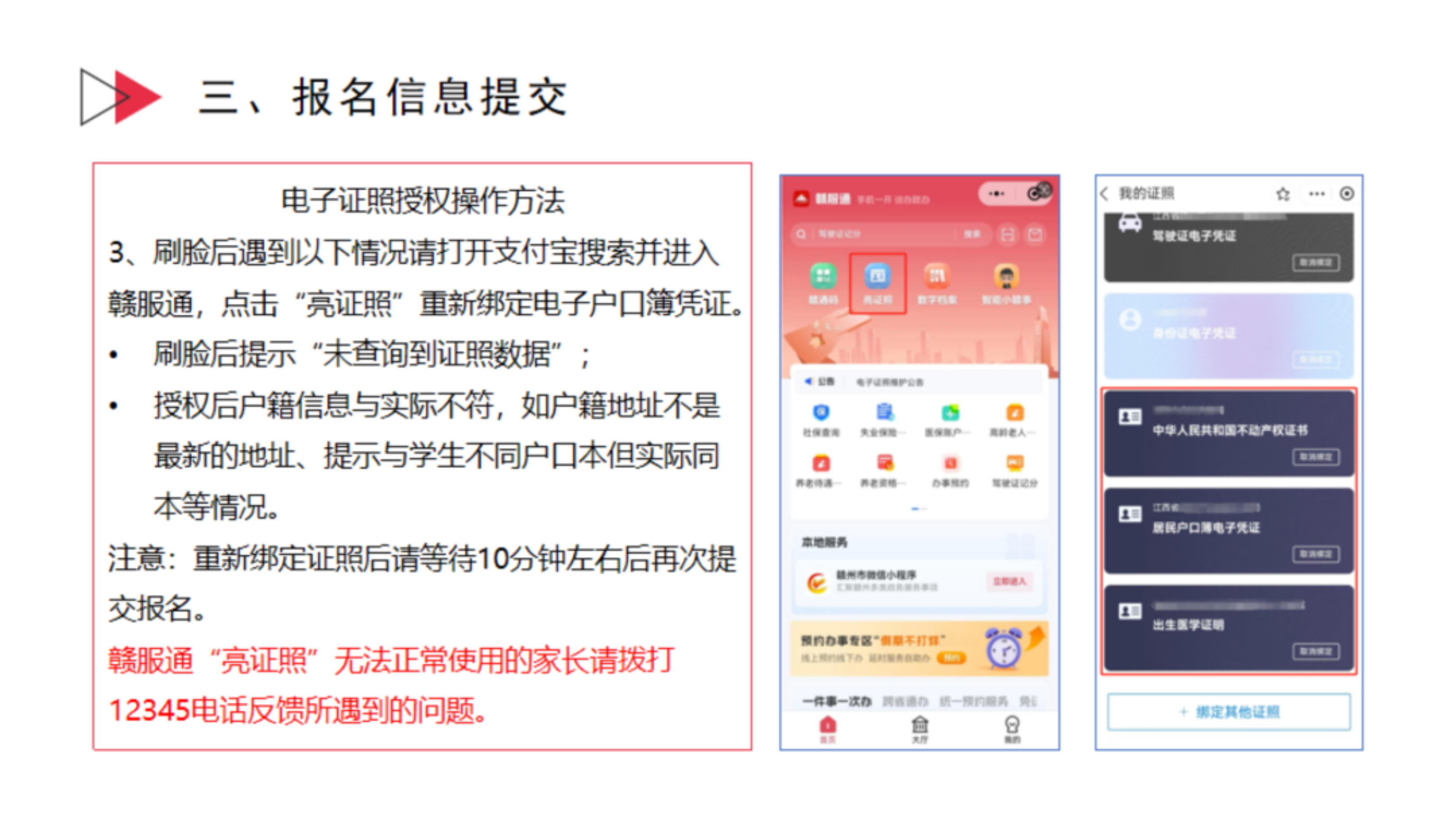 答:领取电子证照主要是便于后面报名时更加方便快捷,如您是江西省户籍则需要领取居民电子户口簿凭证,如非江西省户籍则无需操作。如您在本地区有房(不动产),为了便于后续报名操作建议领取不动产证照,无房的则无需操作。如您在“赣服通”亮证照里面没有查询到你报名所需要的房产,可以到报名时间进入系统进行报名,查询看是否有你报名所需房产,系统所对接的数据相对较全。如您的房产性质是公租房无需通过亮证照去领取绑定。