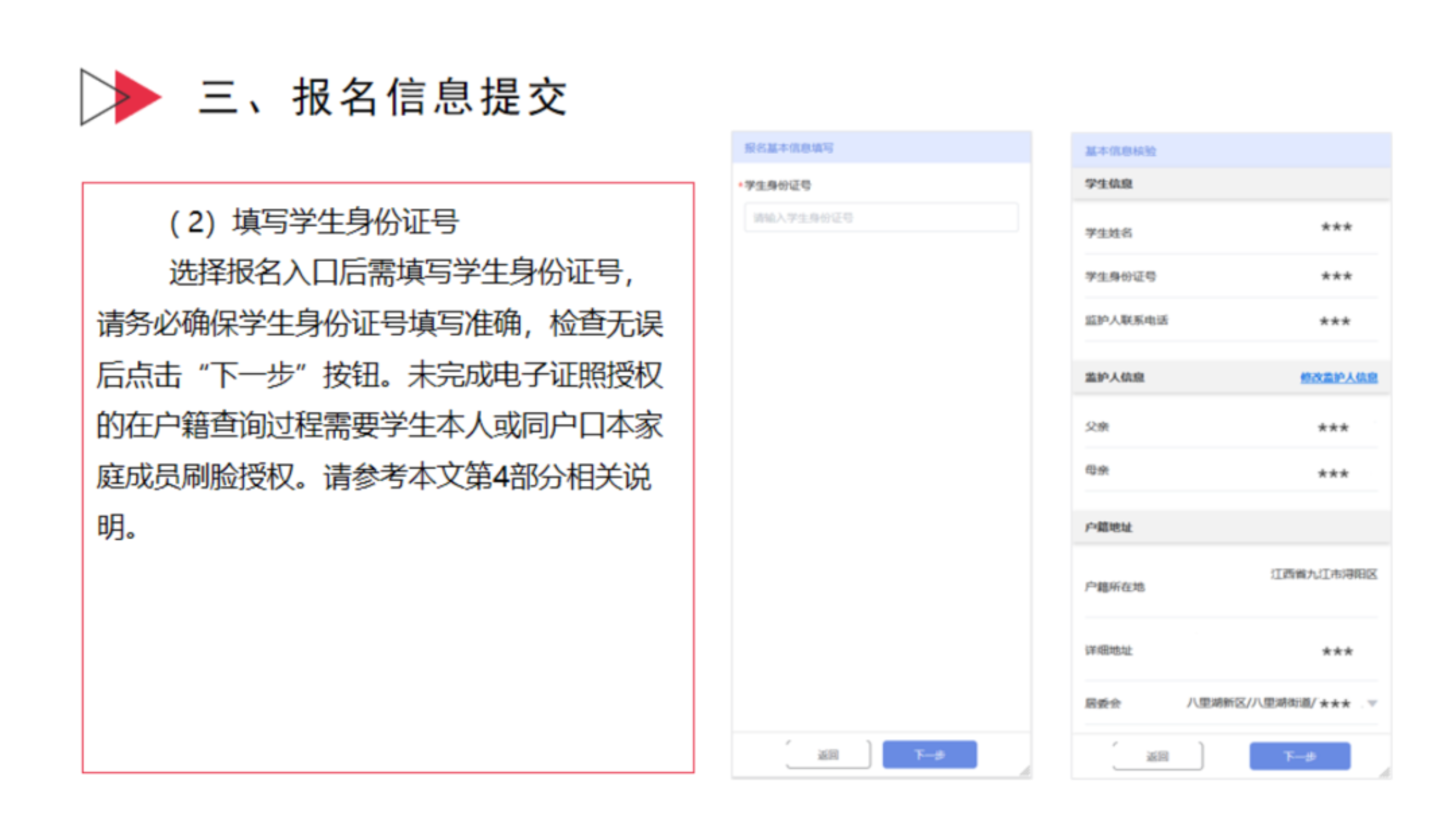 答:家长(需学生亲生父母或与学生在同一户口本上的亲属)可登录赣服通(可通过三种方式登录:微信登录、支付宝登录、网址登录),点击“城市服务”并更改“站点切换”为“庐山市”,然后下滑并点击“入学一件事”,即可进行网上报名,通过填写小孩身份证号码,经过“电子证照授权”后,系统受理并自动核验小孩基本信息。