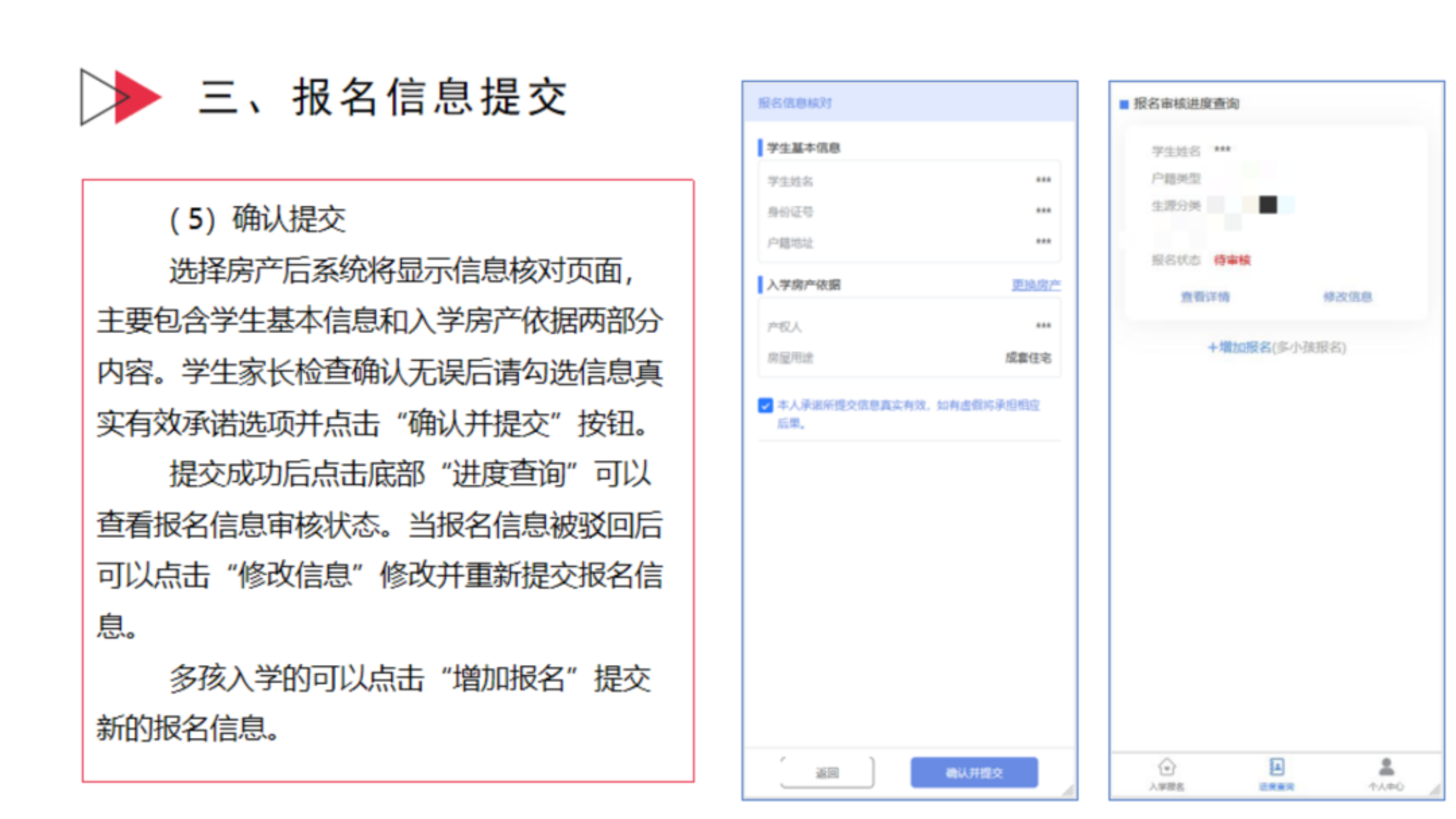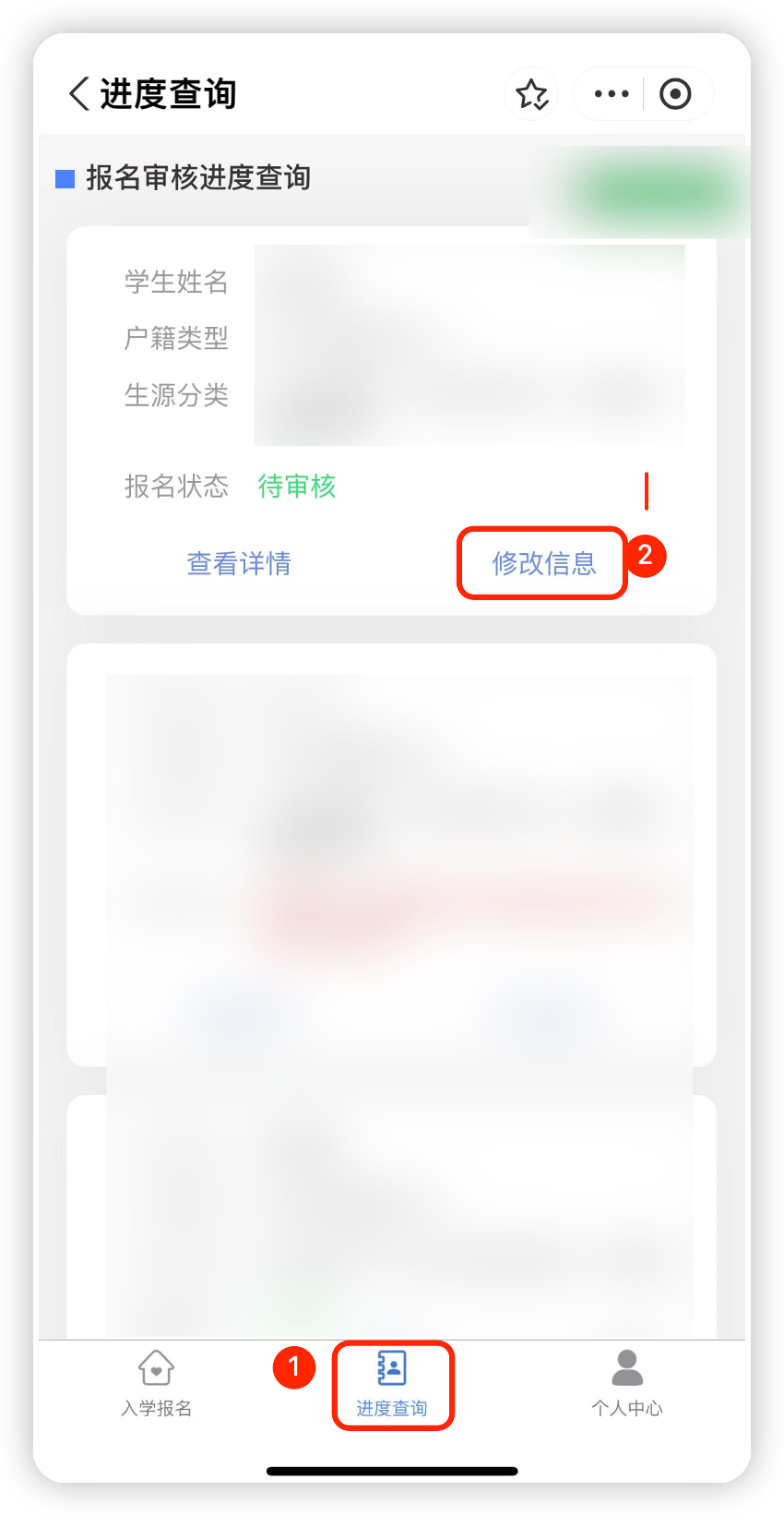 答:平台最终报名结果,以报名时最后一次提交的信息为准,请仔细核对所填报的信息是否正确。如有误,可在报名时间截止前登录平台进行修改。报名时间截止前,家长修改信息不受操作次数限制。报名时间截止后,平台关闭,家长无法再进行信息修改。具体操作流程:进入报名系统后,点击进度查询,进入进度查询页面,点击修改信息,进入修改。