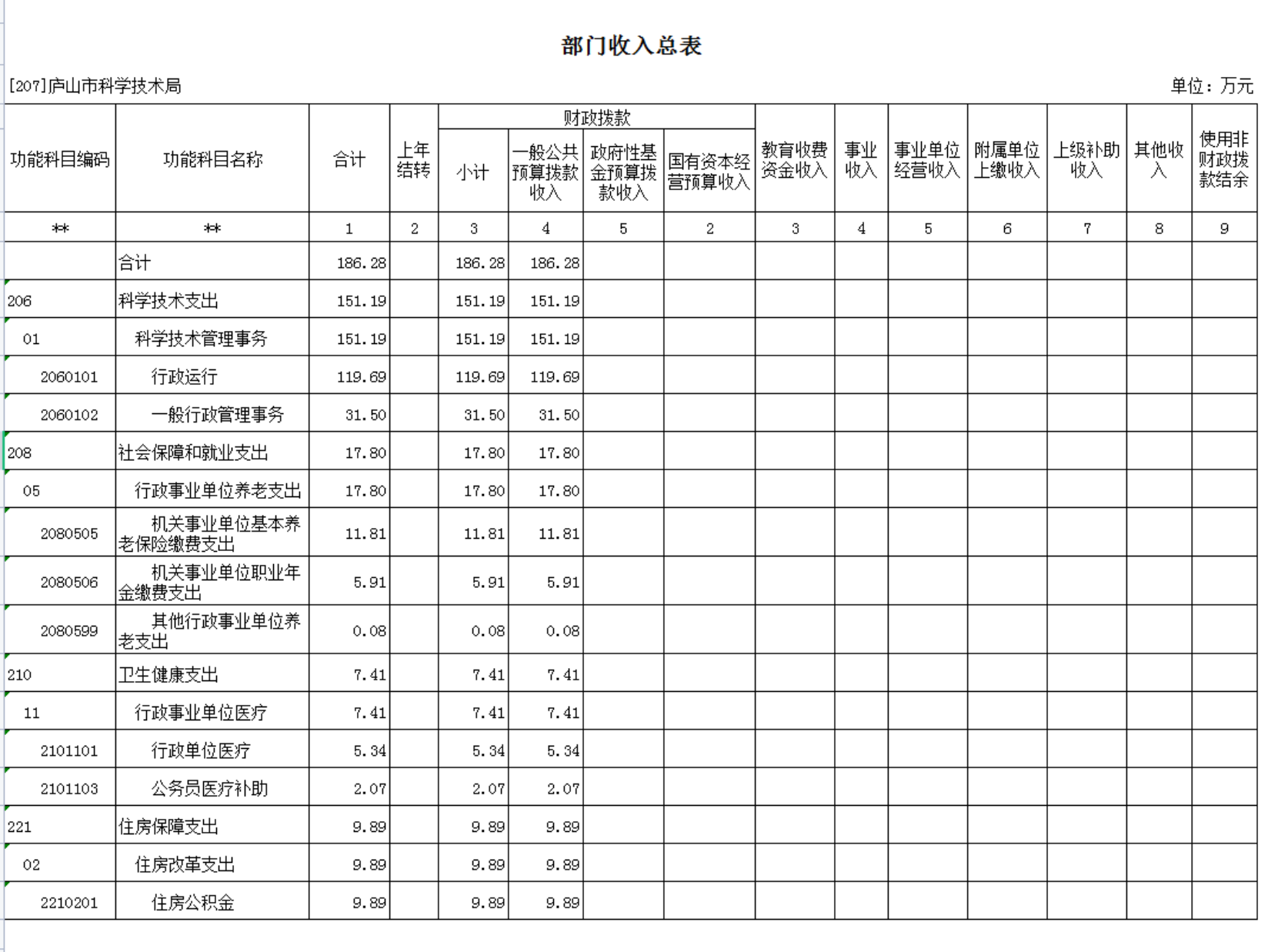 2024年庐山市科学技术局收入预算总额186.28万元,较上年预算安排减少120.18万元;财政拨款收入186.28万元,较上年预算安排减少112.18万元;事业单位经营收入0万元,较上年预算安排增加(减少)0万元。减少原因:受奖补企业名单年初不能确定,科技创新奖励项目经费按照市财政局要求纳入市政府预算,不再纳入本部门年初预算。