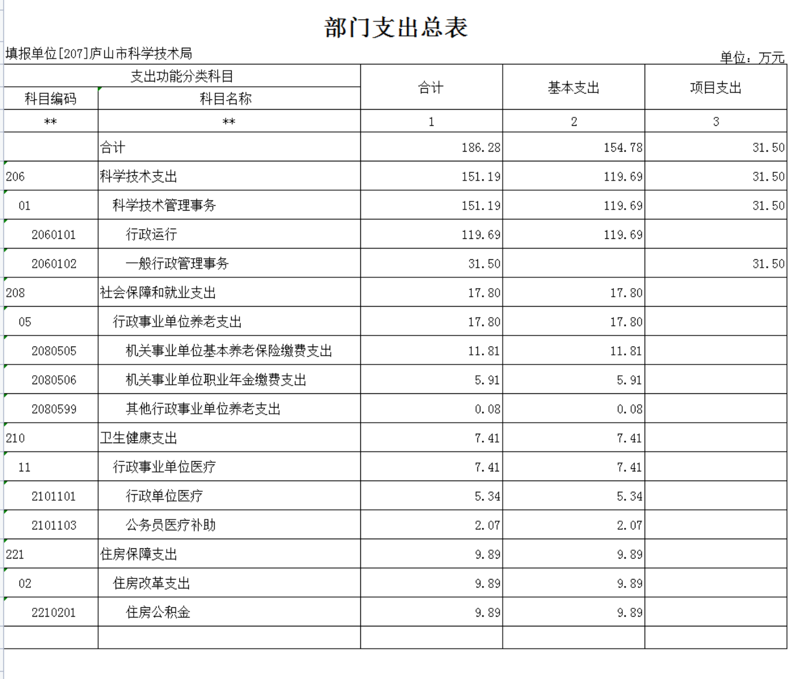 按支出功能科目划分:科学技术支出151.19万元,较上年预算安排减少112.07万元;社会保障和就业支出17.8元,较上年预算安排减少0.55万元;卫生健康支出7.41万元,较上年预算安排增加2.1万元;住房保障支出9.89万元,较上年预算安排减少1.66万元。