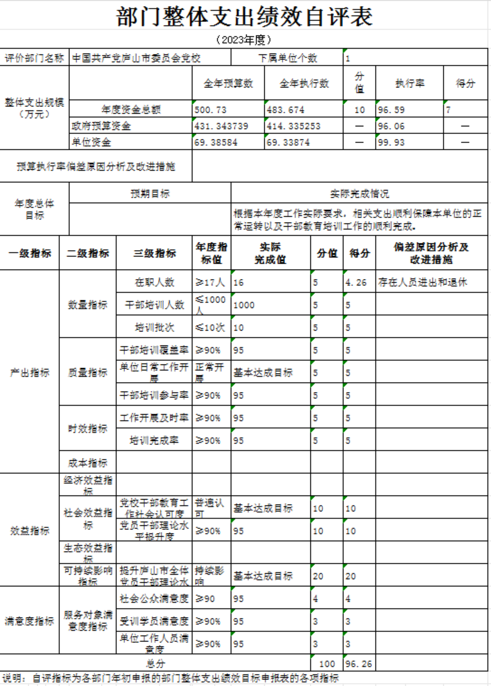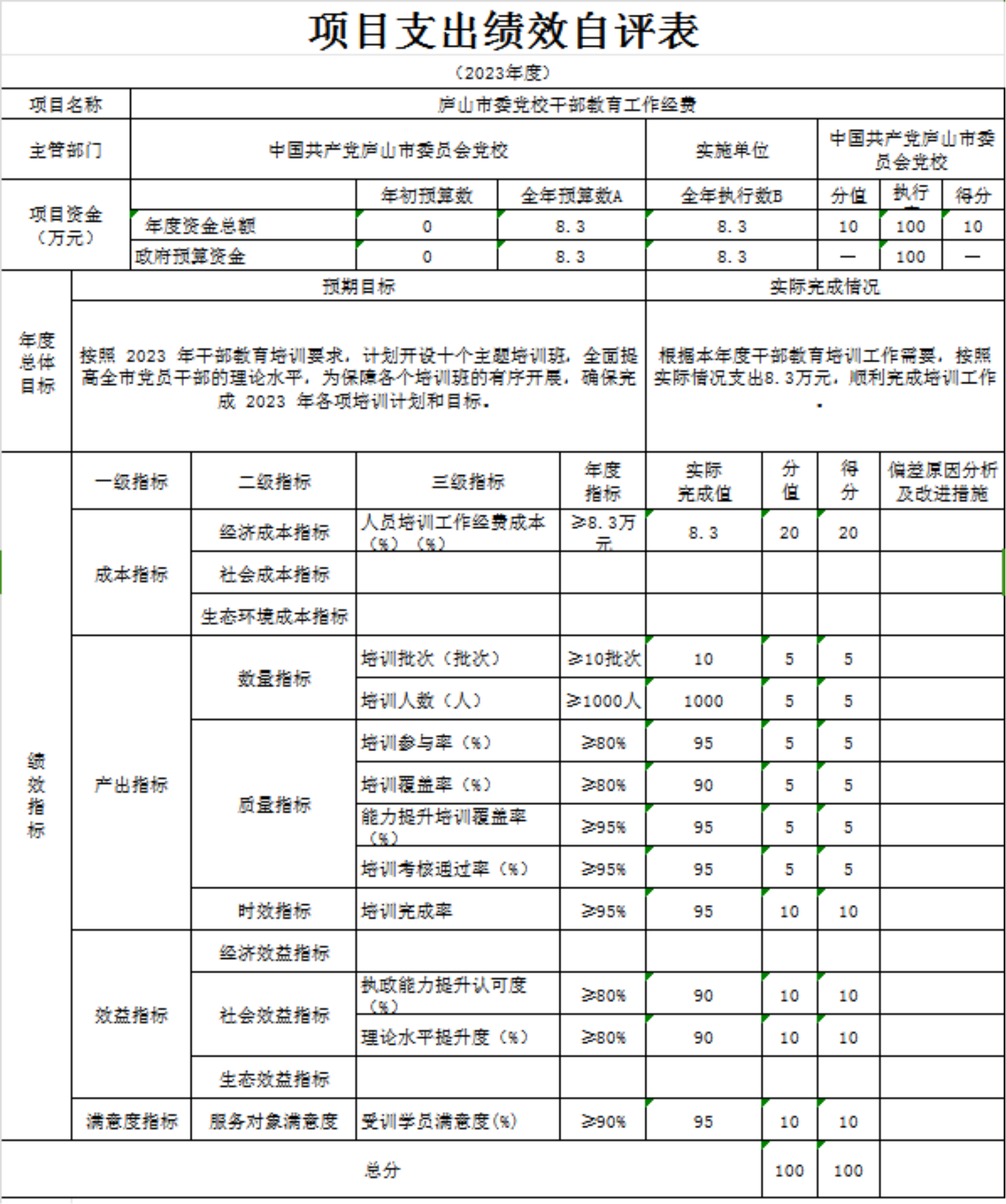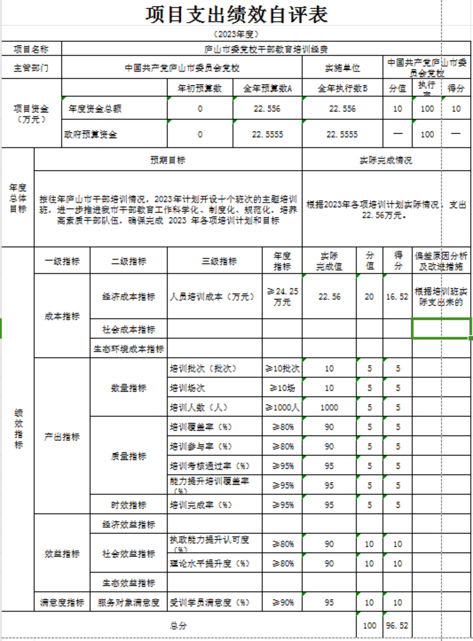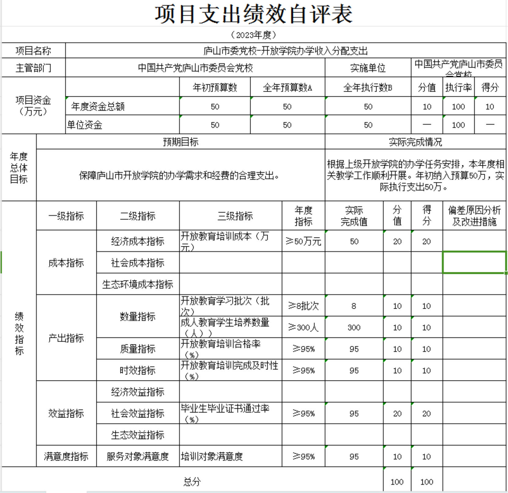 本部门“庐山市委党校干部教育培训经费、庐山市委党校干部教育工作经费、庐山市委党校-开放学院办学收入分配支出、庐山市委党校2023年事业收入项目支出绩效自评表”自评结果如下。