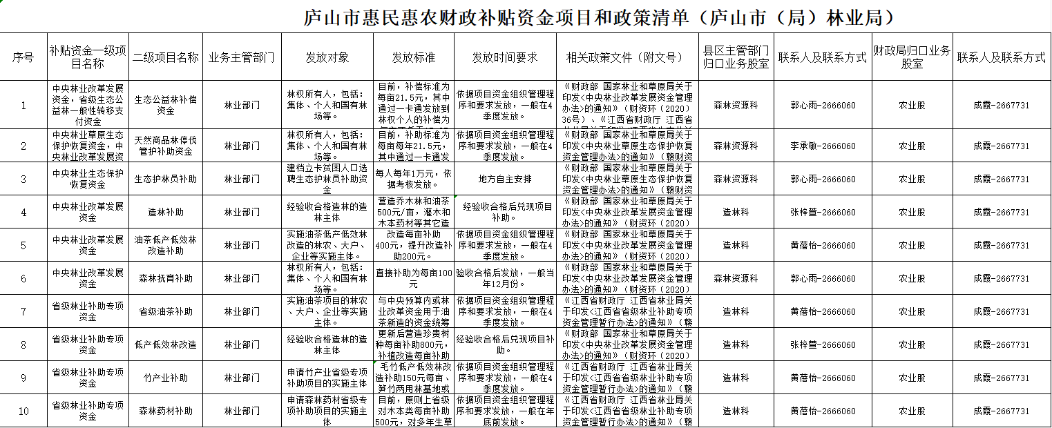 庐山市(局)林业局惠民惠农财政补贴资金项目和政策清单