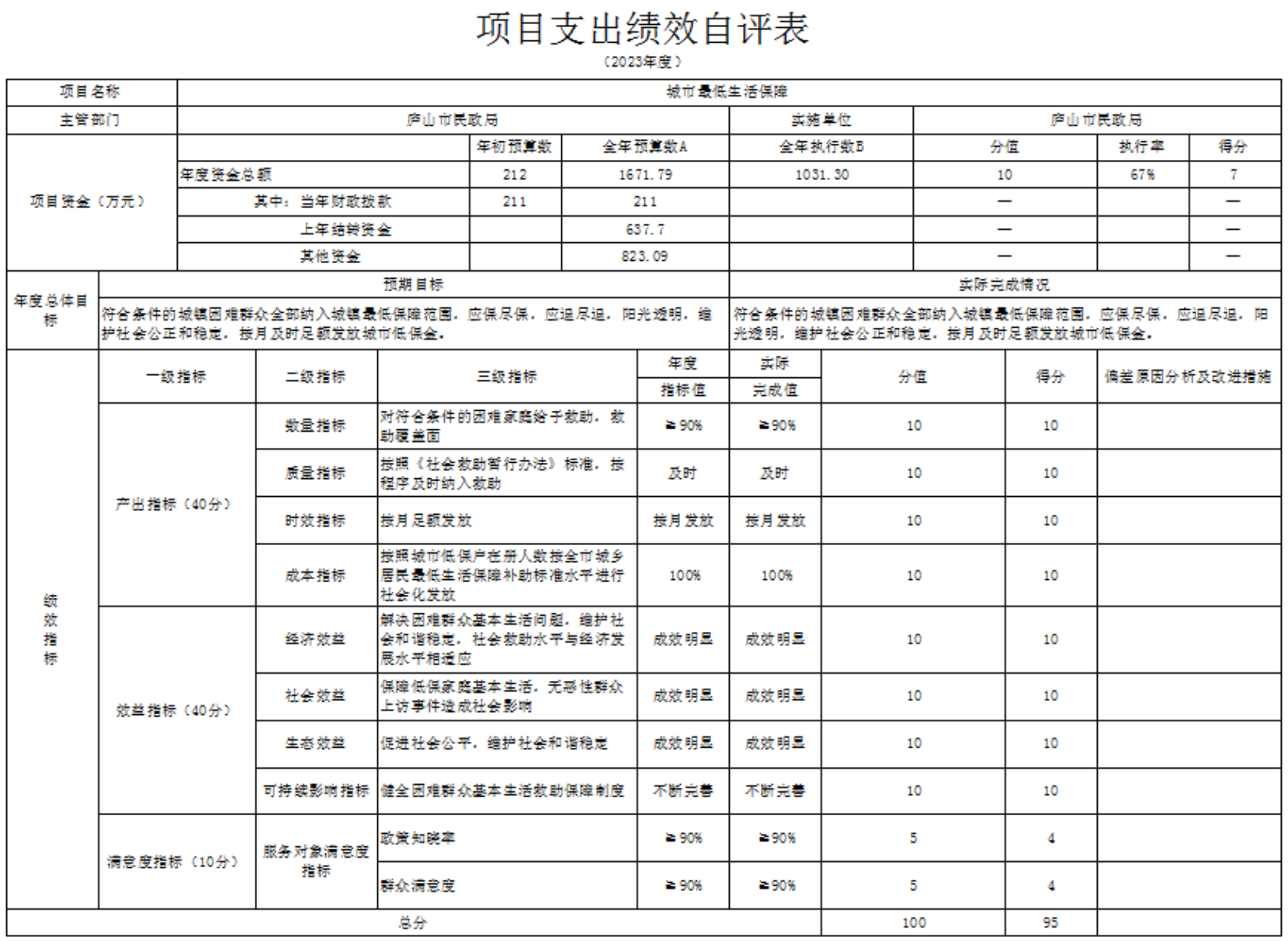 产出指标分值为40分,评价得分为40分,得分率为100%。严格按照城市低保户在册人数按全市城乡居民最低生活保障补助标准水平进行社会化发放。