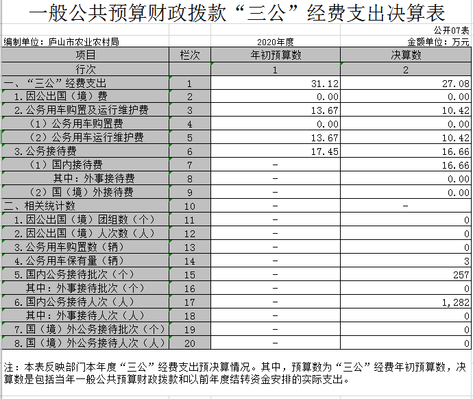 28.“三公”经费:纳入县级财政预决算管理的“三公”经费,是指部门用财政拨款安排的因公出国(境)费、公务用车购置及运行费和公务接待费。其中,因公出国(境)费反映单位公务出国(境)的国际旅费、国外城市间交通费、住宿费、伙食费、培训费、公杂费等支出;公务用车购置及运行费反映单位公务用车车辆购置支出(含车辆购置税)及租用费、燃料费、维修费、过路过桥费、保险费、安全奖励费用等支出;公务接待费反映单位按规定开支的各类公务接待(含外宾接待)支出。