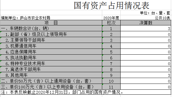 截至2020年12月31日,本部门(单位)国有资产占用情况见公开10表《国有资产占用情况表》。本部门共有其他车辆3辆,其中一辆是执法用勤车,两辆是专业技术用车。