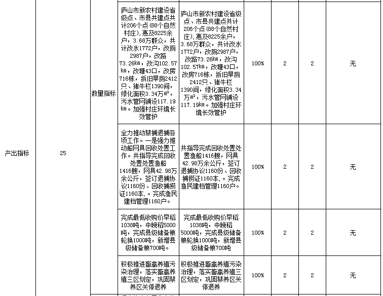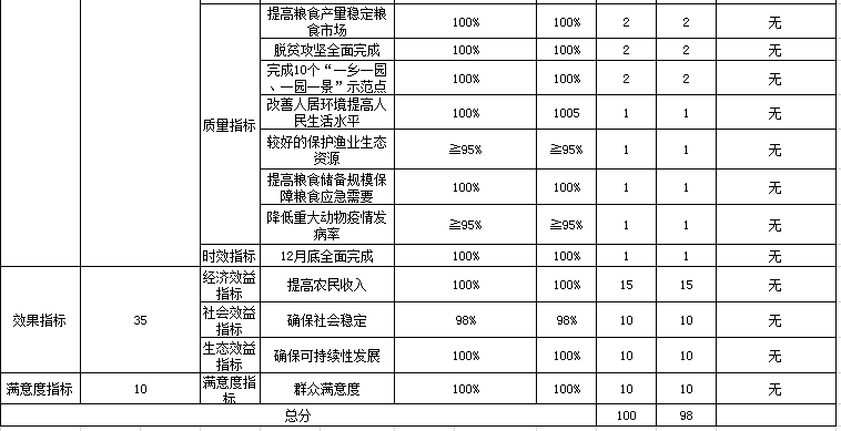 2、质量指标:提高了粮食产量及粮食储备规模。稳定了粮食需要全面完成脱贫攻坚及10个“一乡一园一园一景”示范点打造,较好的保护渔业生态资源及控制了动物疫情发病率,更好的提高了农民人居环境。