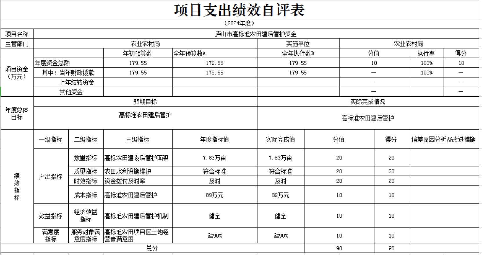 风险保障水平高于去年、进一步提高动物疫情应急处理能力、保障我市各乡镇农业血防传播阻断达标、耕地地力质量提升、检查各乡镇环境整治进展成效多方面情况、村庄卫生洁化、村内沟塘净化、村庄环境美化、村内道路畅通、村庄设施完好、农户建房有序。完善审批机制、风险保障总额高于去年、提升农民农技水平、田间基础设施正常发挥作用有所提升、有效遏制病虫害爆发流行成灾、有健全的高标准农田建后管护机制、保质保量完成审计任务、灾后生产能力基本恢复、提升农产品加工水平明显提高、动物疫情预警能力提升、保障粮食执法工作正常运转、村庄整治达标、提升庐山市云雾茶产业协会机构运转能力。