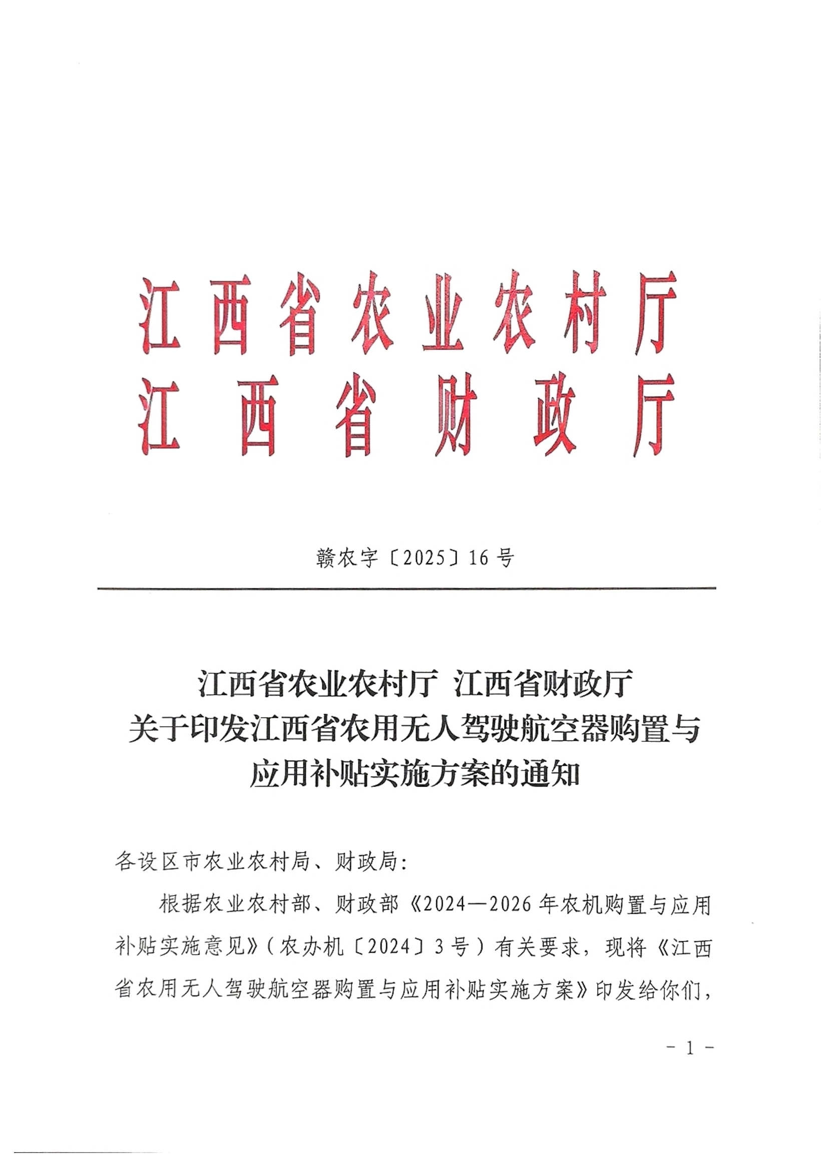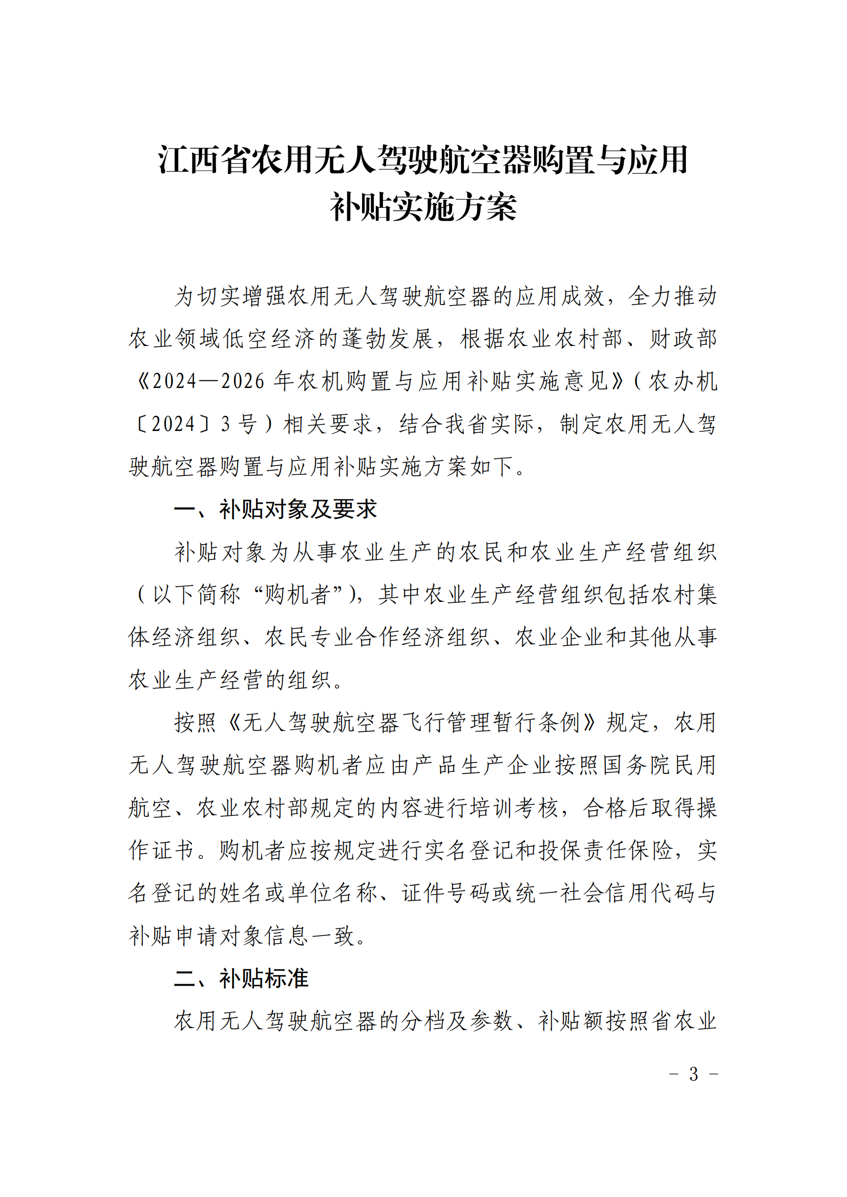 关于印发江西省农用无人驾驶航空器购置与应用补贴实施方案的通知