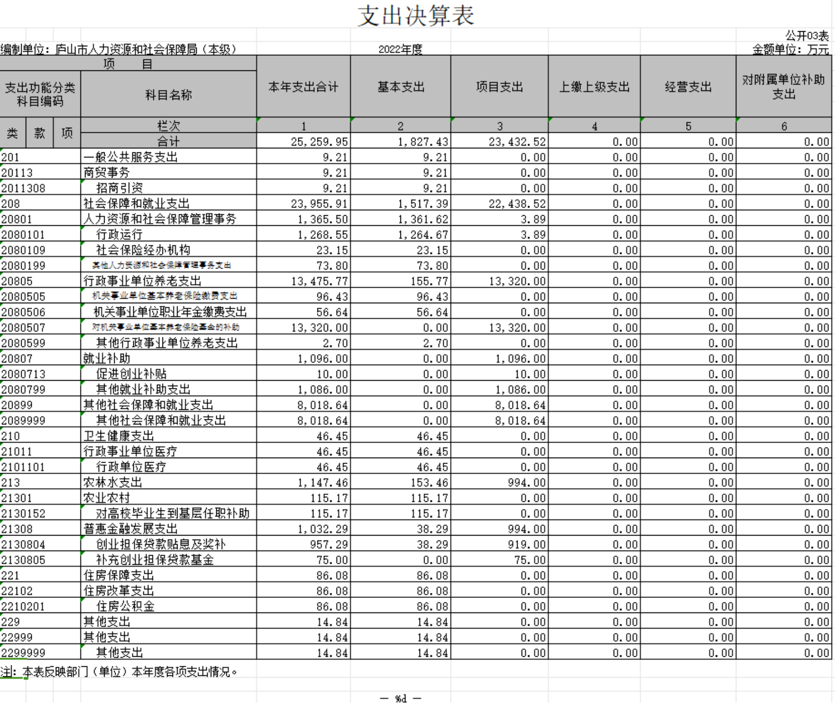 本单位2022年度支出总计25259.95万元,其中本年支出合计 25259.95 万元,较2021年增加22326.41 万元,增长761 .1 %,主要原因是:人社局2022年养老保险中央财政补助资金(中央级)2030万元、机关养老县级财政补助资金8000万元、人社局2022追加机关养老保险财政补助资金3000万元、就业补助资金1096万元、人社局2022年城乡居民养老保险省级财政补助资金(省级)825万元、人社局2022年城乡居民养老保险中央财政补助资金(中央级)3025万元、地方政府偿还改制企业养老保险清欠资金448万元、城乡居民养老保险基础养老金县级财政配套2045.72万元、失地农民养老金缴费补助1100万元等项目收支纳入了单位预决算中;年末结转和结余 0万元,较2021年减少29.39 万元,下降100 %,主要原因是:今年年末无资金结转。