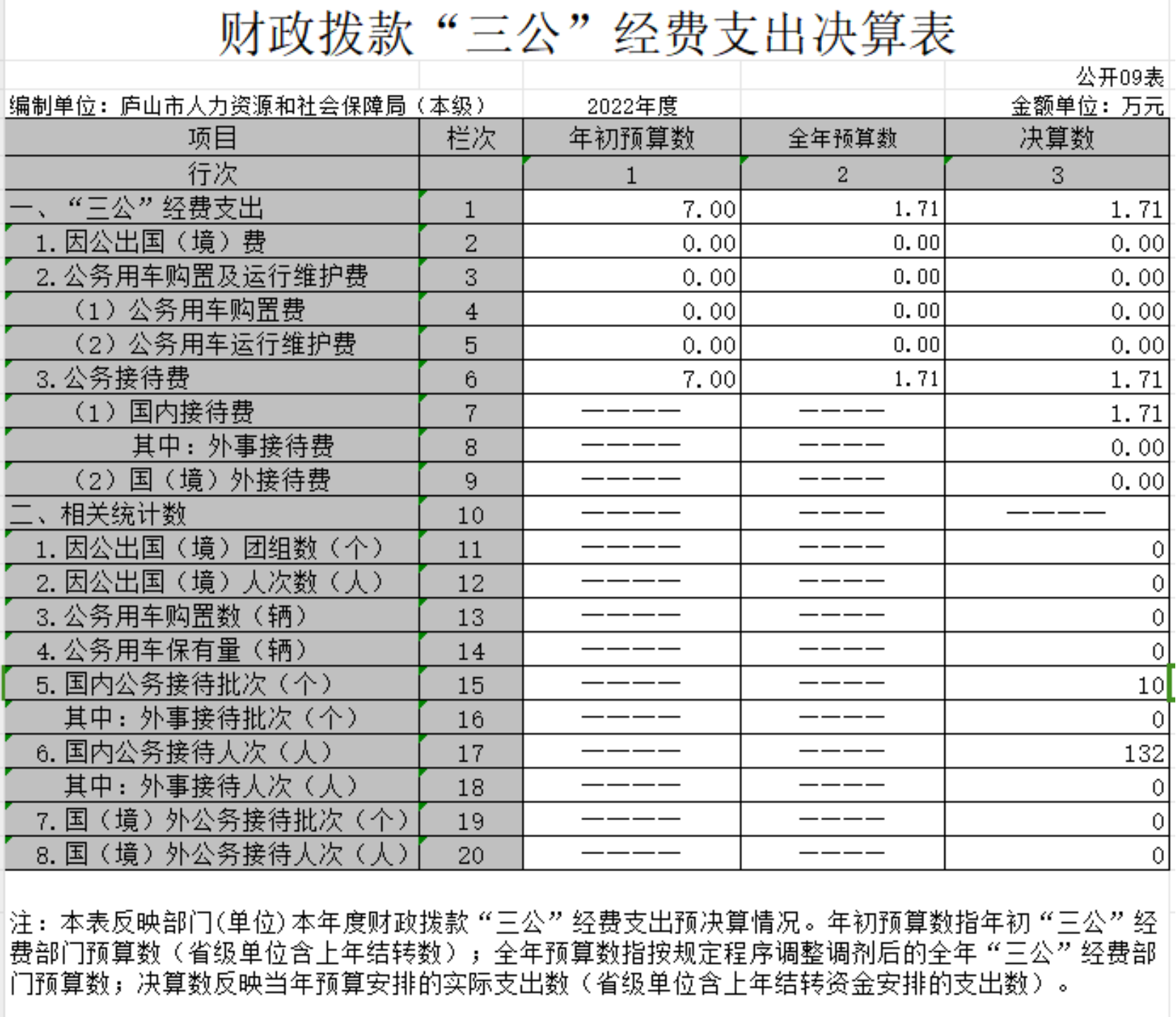 (二)公务接待费支出年初预算数为 7 万元,决算数为 1.71 万元,完成预算的 24.4%,决算数较2021年减少0.05 万元,下降2.8%,主要原因是应政策要求,过紧日子,节省三公经费开支。决算数较年初预算数减少的主要原因是:应政策要求,过紧日子,节省三公经费开支。全年国内公务接待 10批,累计接待132人次,其中外事接待0 批,累计接待 0人次,主要为:考察、调研、检查等。