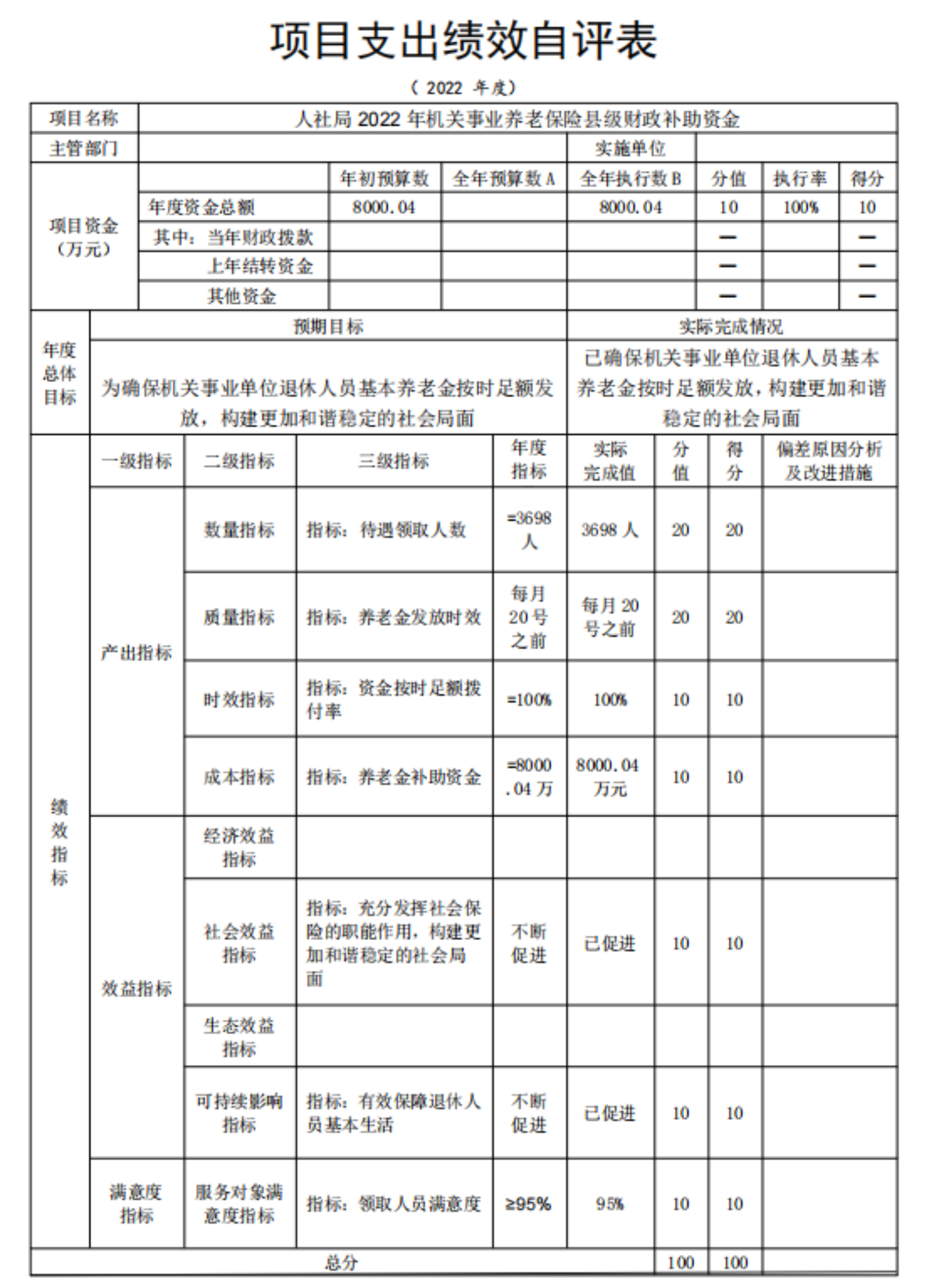 项目绩效自评总体综述:根据年初设定的绩效目标,“人社局2022年机关事业养老保险县级财政补助资金”项目绩效自评得分为100 分,项目全年预算数为8000万元,执行数为 8000万元,完成预算的100%;1、履职完成情况:已完成年初制定的绩效目标。2、履职效果情况:资金资金按时足额拨付,有效保障退休人员基本生活,充分发挥了社会保险的职能作用,维护社会稳定。3、社会满意度及可持续性影响:退休人员满意度都95%以上,取得了良好的社会效益。
