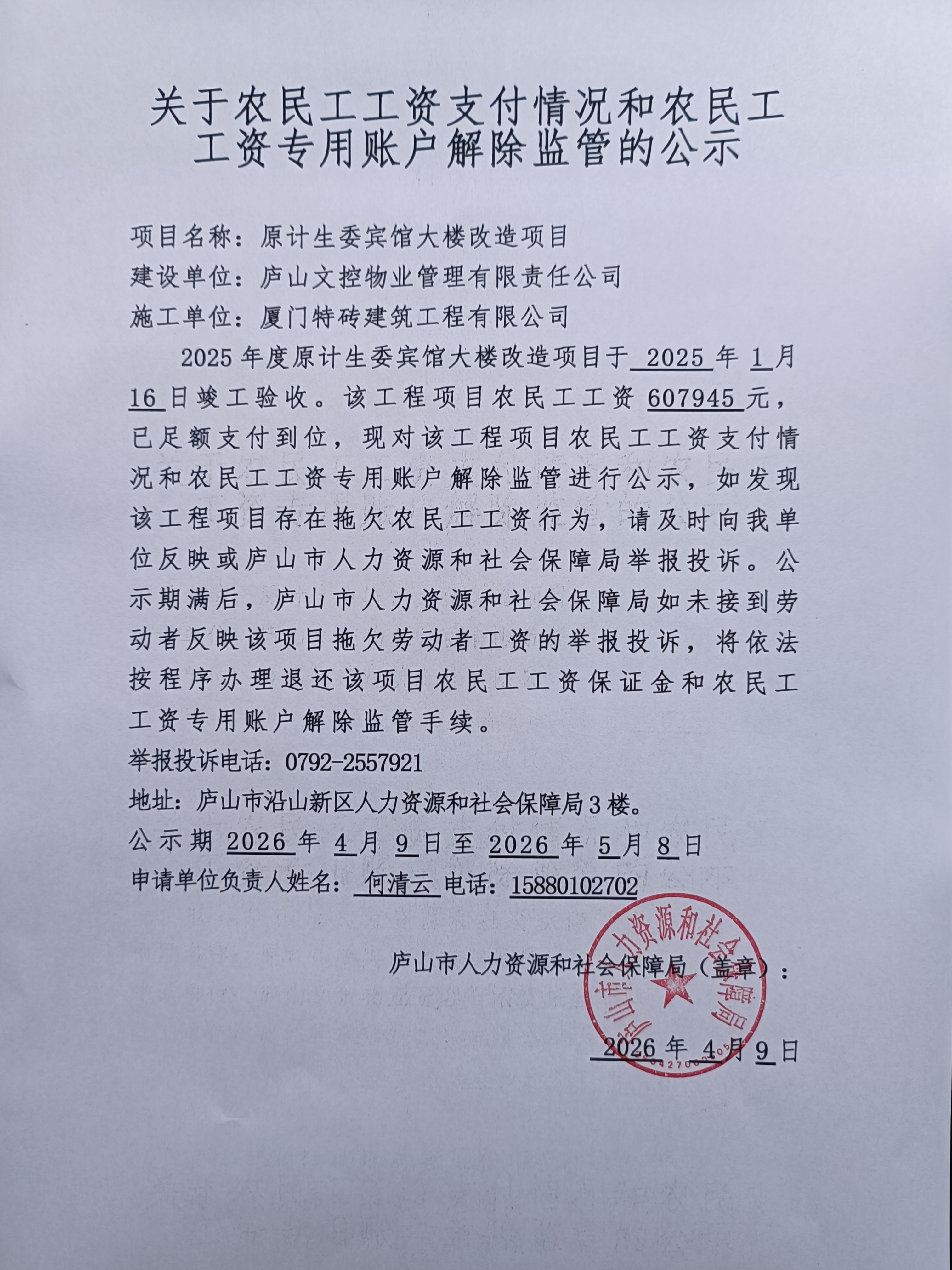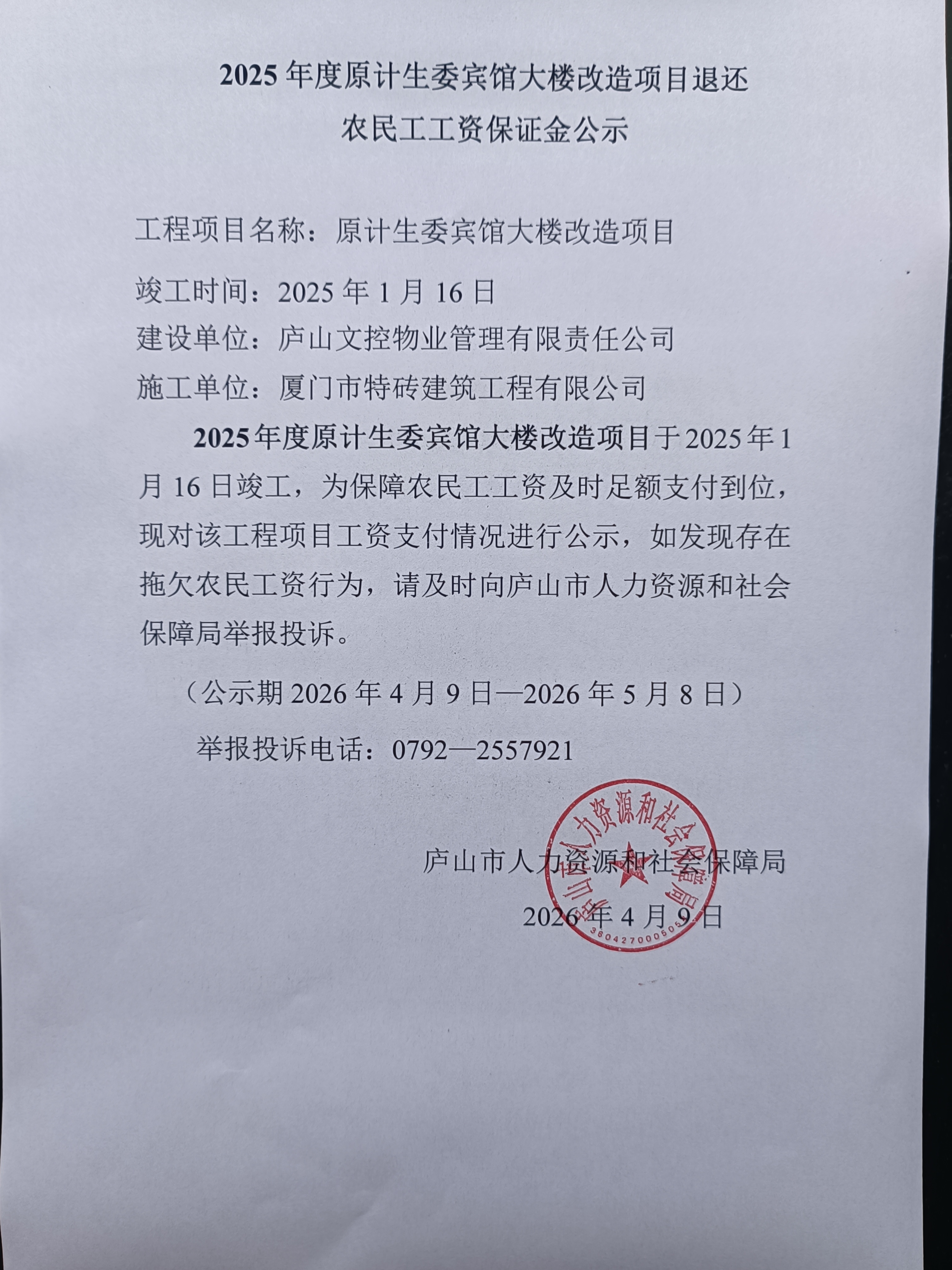 2025年度原计生委宾馆大楼改造项目退还农民工工资保证金及注销农民工工资专户公示