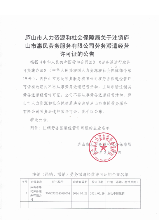 关于注销庐山市惠民劳务服务有限公司劳务派遣经营许可证的公告