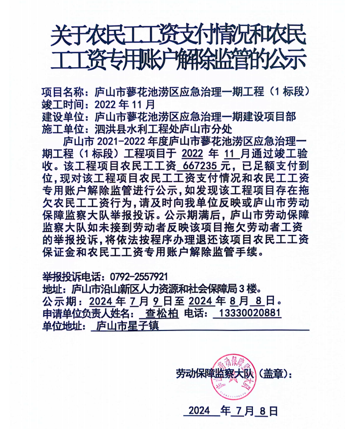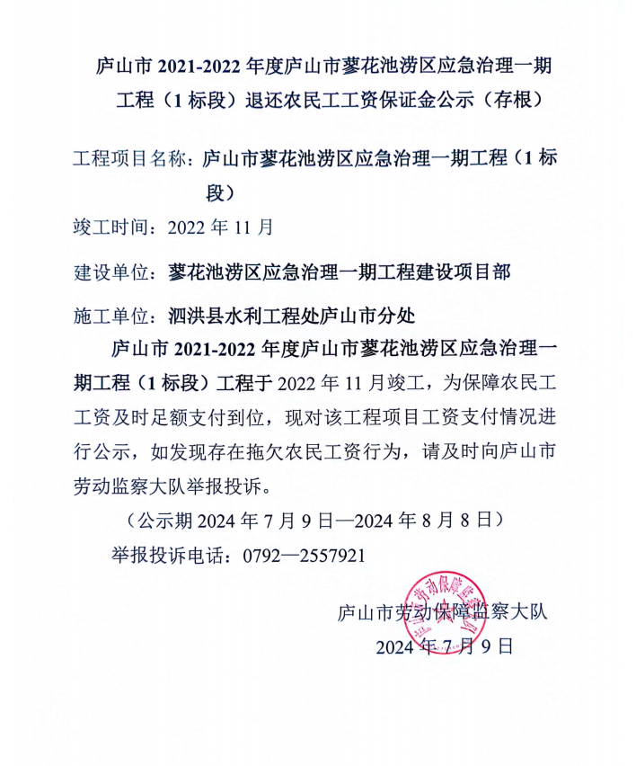 庐山市2021-2022年度庐山市蓼花池涝区应急治理一期工程(1标段)退还农民工工资保证金及注销农民工工资专用账户公示