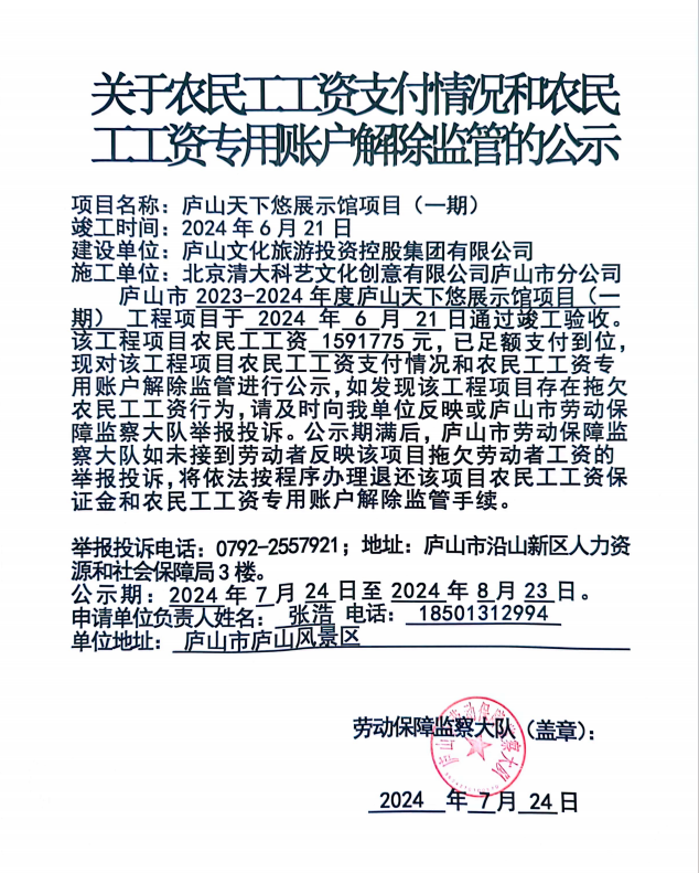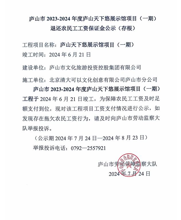 庐山市2023-2024年度庐山天下悠展示馆项目(一期)退还农民工工资保证金及注销农民工工资专用账号公示